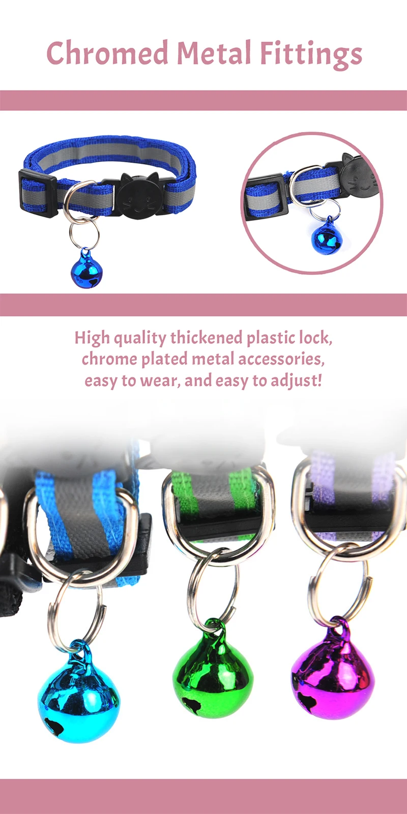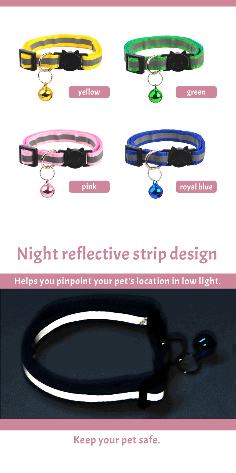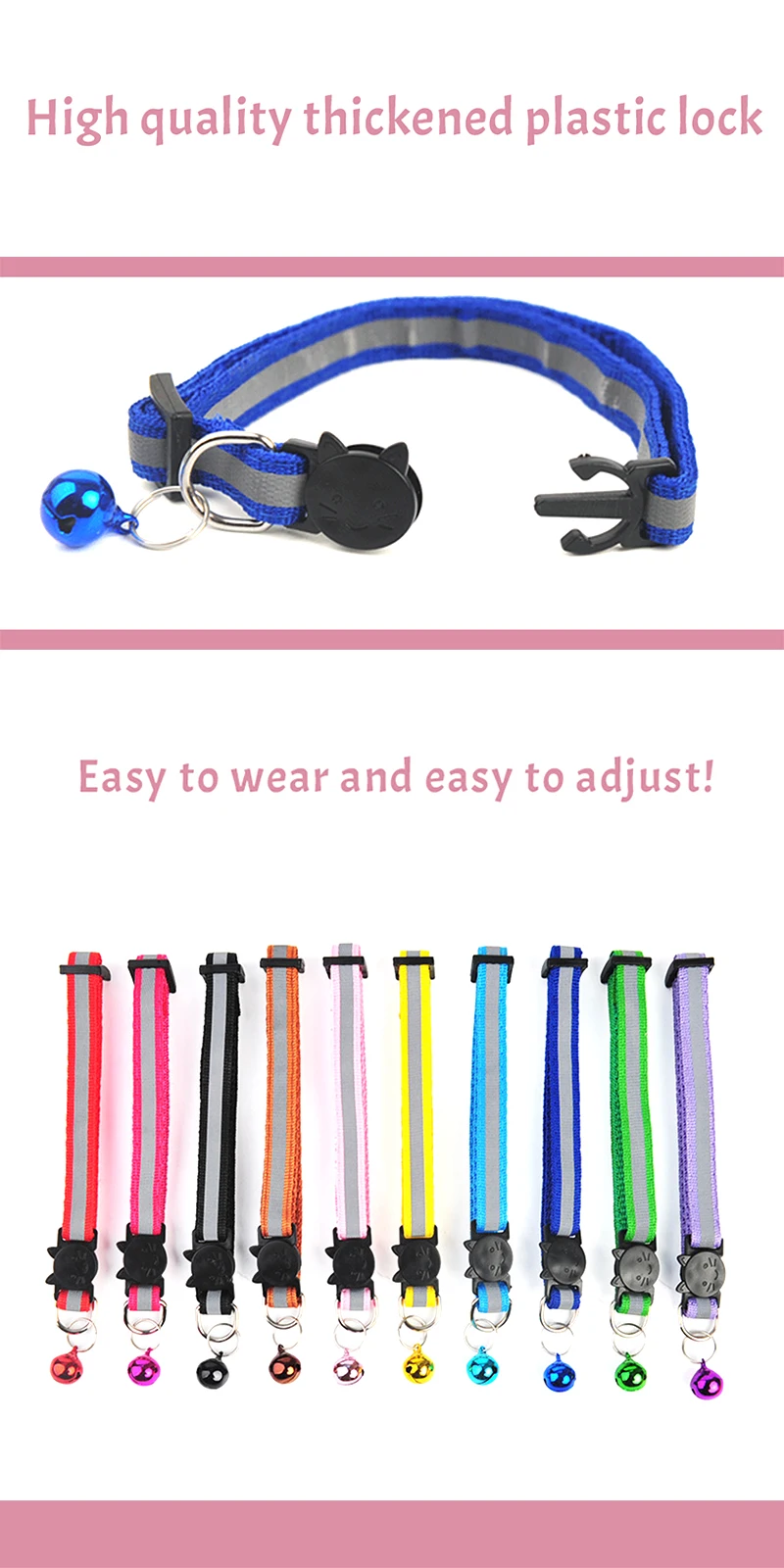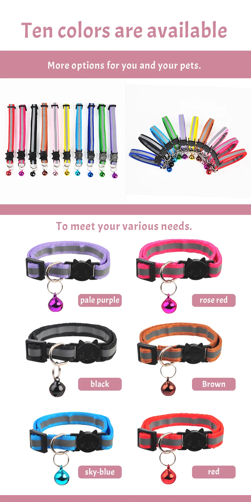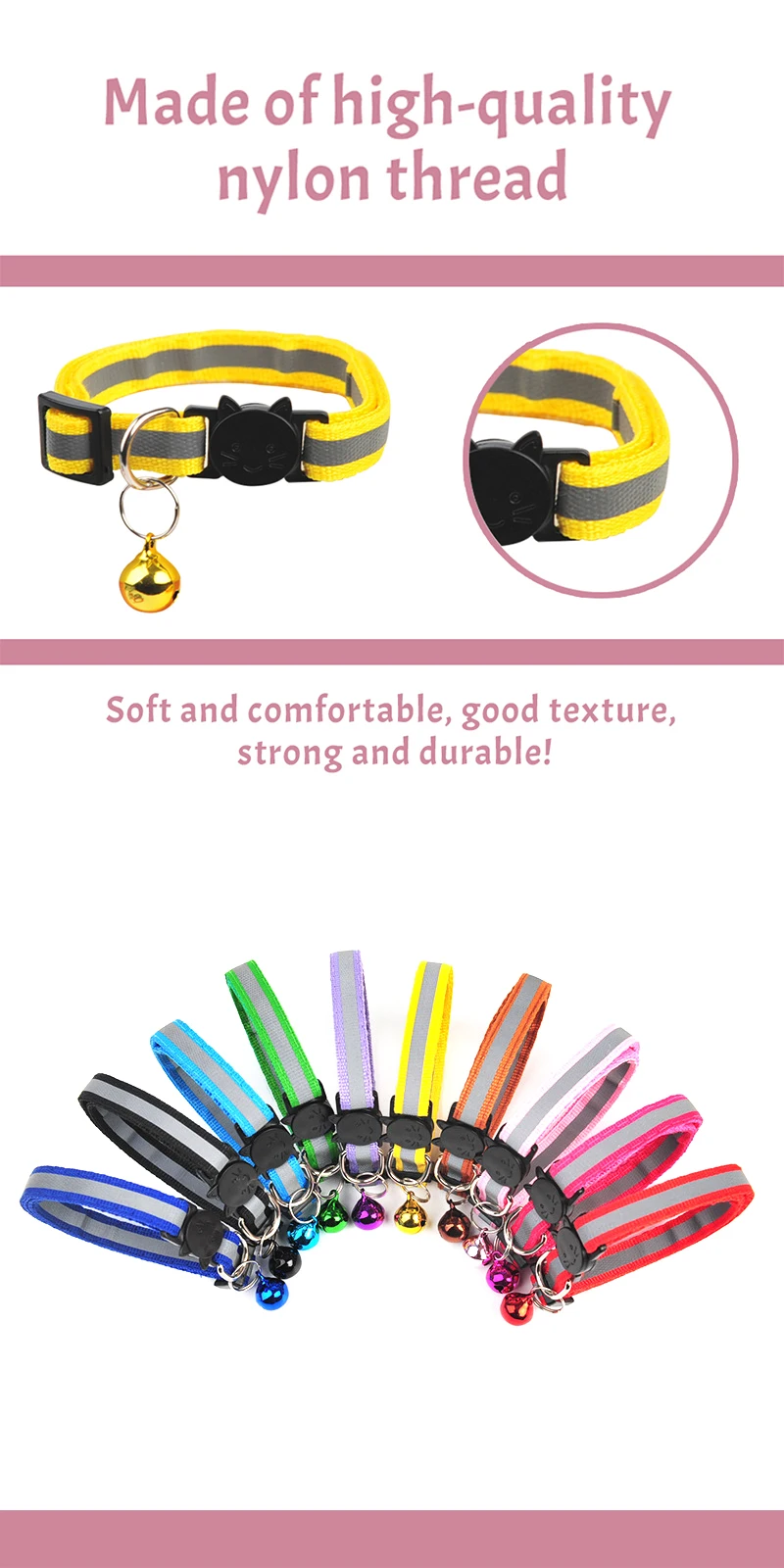 2. Прочный Нейлоновый воротник, яркий цвет, красивый и модный! И есть дизайн Ночной светоотражающей полосы, специальное отражающее покрытие позволяет домашним животным путешествовать ночью по-прежнему привлекает внимание, более безопасно!