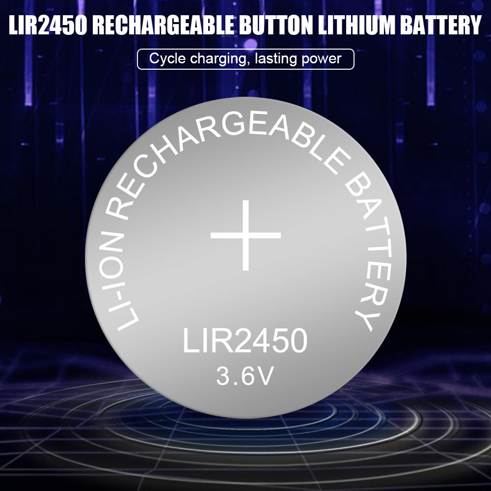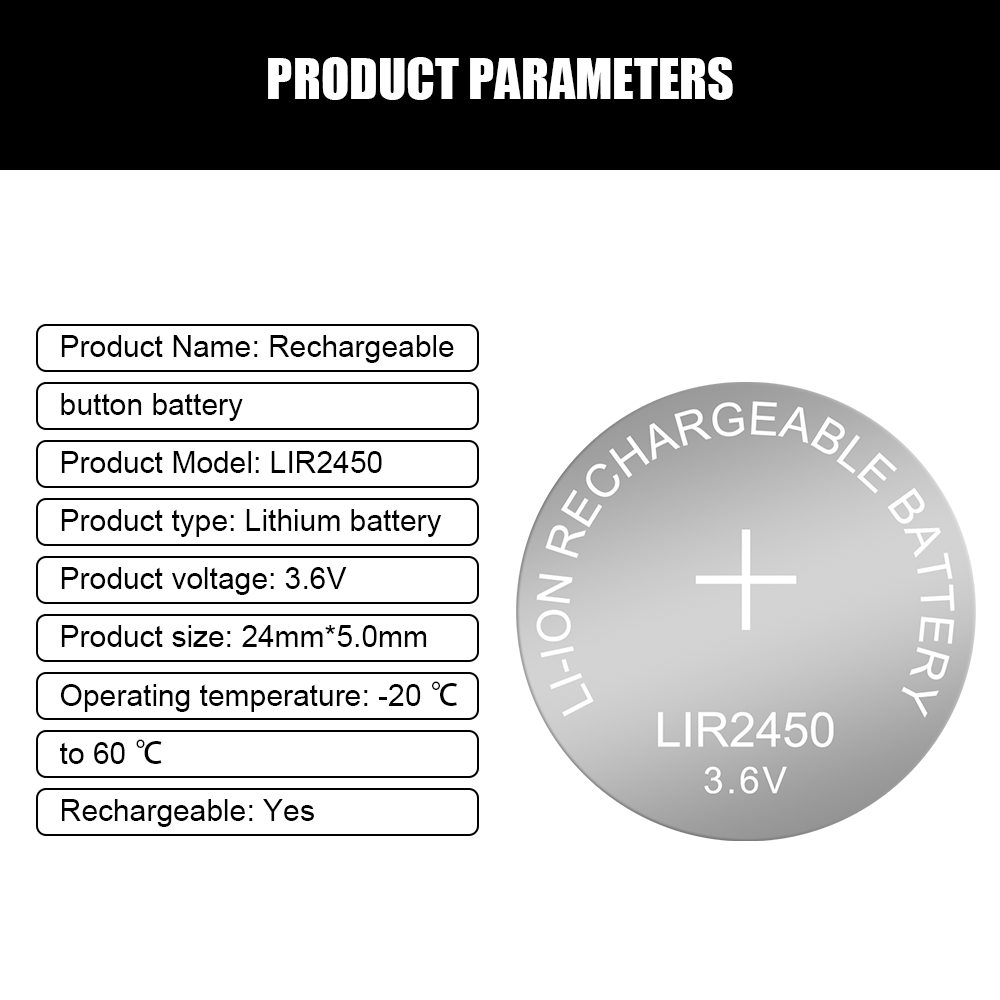 Brand NameDewtoxModel NumberLIR2450OriginMainland ChinaSize24.5*5mmis_customizedYesCertificationCENominal Capacity120mAhBattery TypeLi-ionNominal Voltage3.6VMeasurement unitpiece/piecesSold insell_by_pieceEach pack1Package weight0.126Package size - length (cm)18Package size - width (cm)15Package size - height (cm)5RechargebleYESCapacity120mAhNominal Voltage3.6VCycle Index500timesApplicable productCar battery, remote control Battery