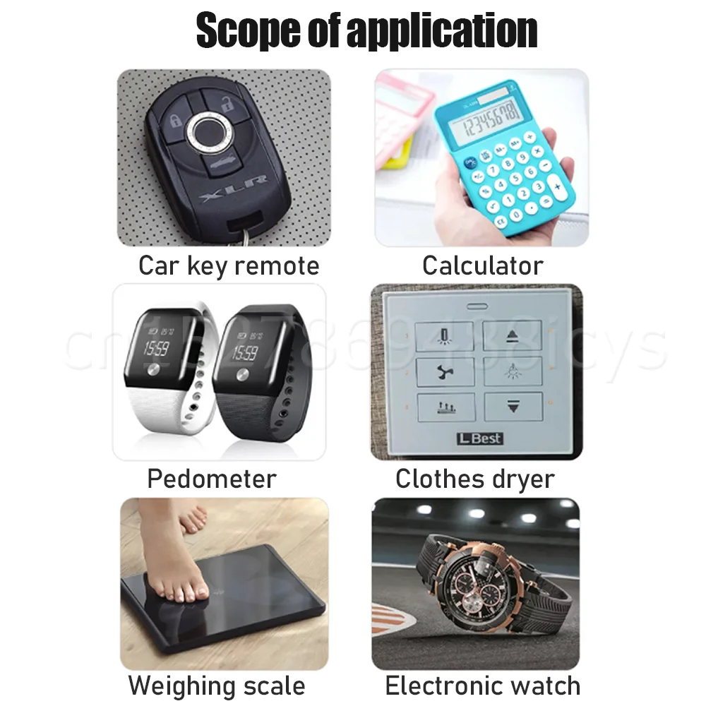 Применимые типы: игрушки, калькуляторы, лазерные указки, камеры, часы, часы, компьютеры, игры, цифровые камеры, видеокамеры, КПК, пульты дистанционного управления, электронные инструменты, цифровые диктофоны, измеритель уровня глюкозы в крови, измеритель уровня холестерина, светодиодный светильник
