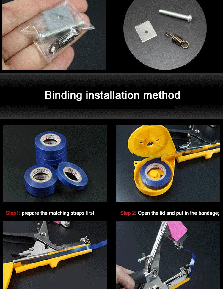2: ручная веревочная вязка трудоемкая, низкая эффективность и легко повредить нежные стебли и лозы. Обвязочная машина использует пластиковый ремешок в качестве обвязочной веревки, которую можно использовать одной рукой, чтобы завершить обвязку, чтобы связать обрезные стебли и лозы.