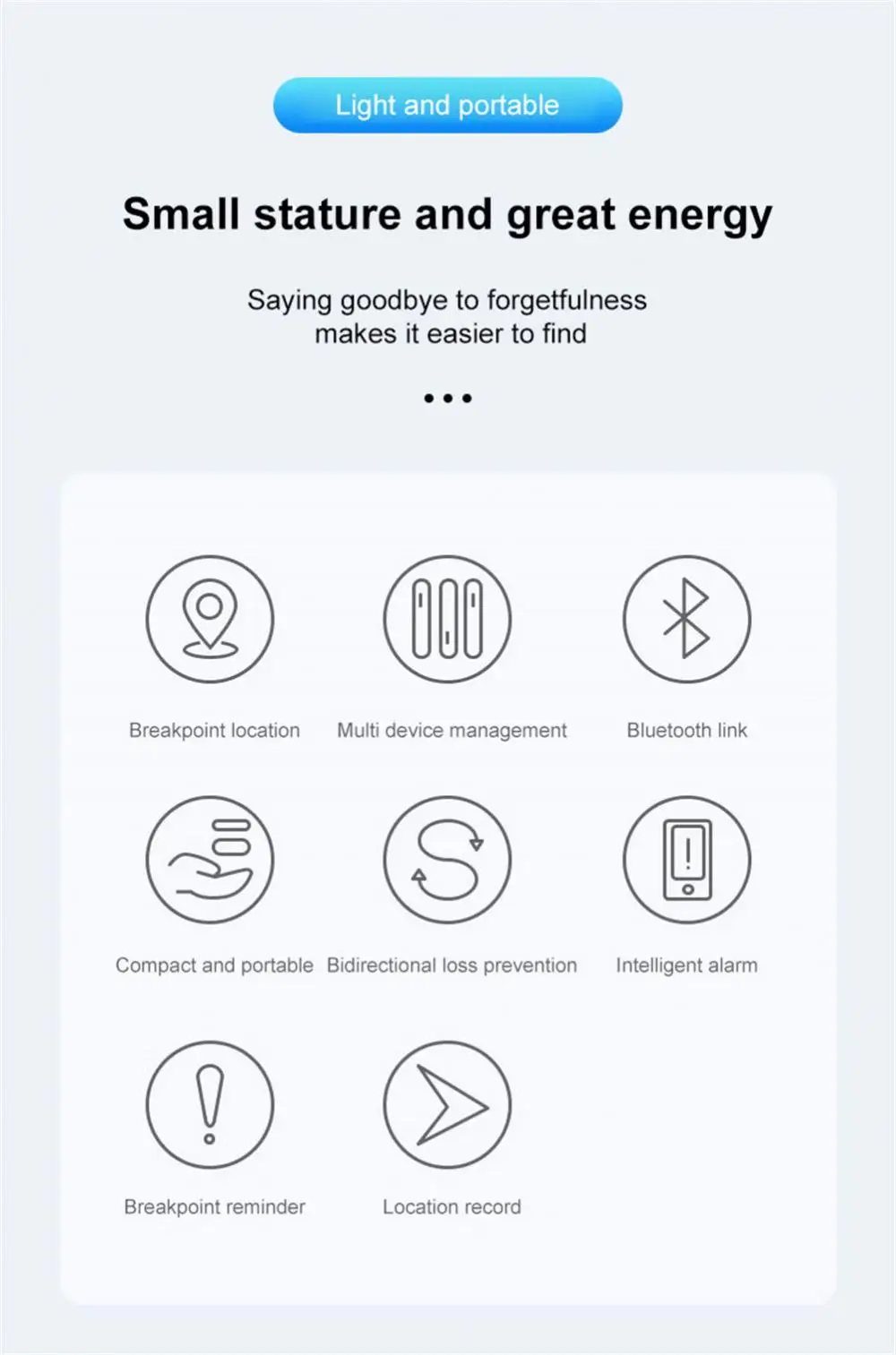 • [Совместимость и размер:] App. Размер: 1.5inX1.5inX0.29in. Он поддерживает iOS и Android-телефон. Подходит для кошелька, автомобиля, детей, домашних животных, сумок, чемоданов или других вещей.