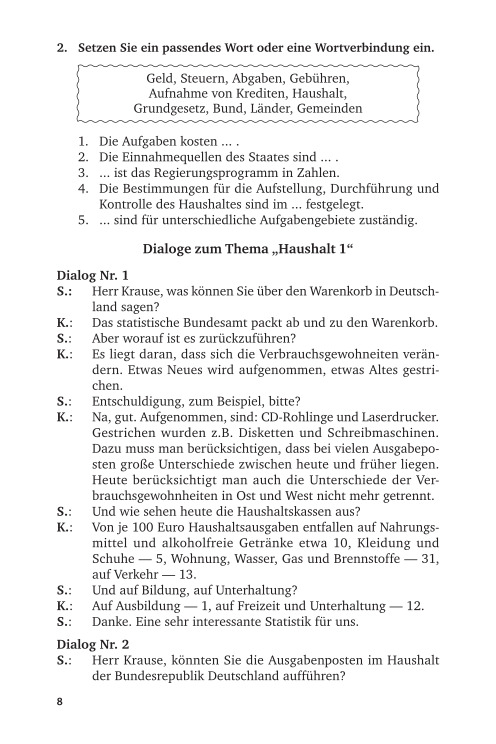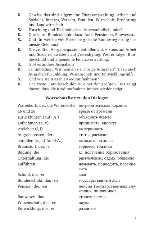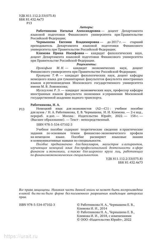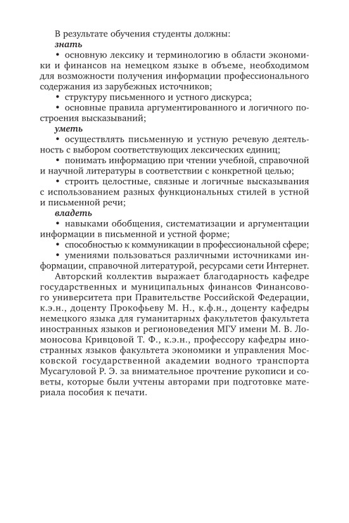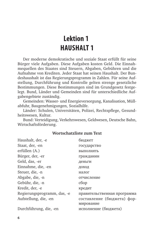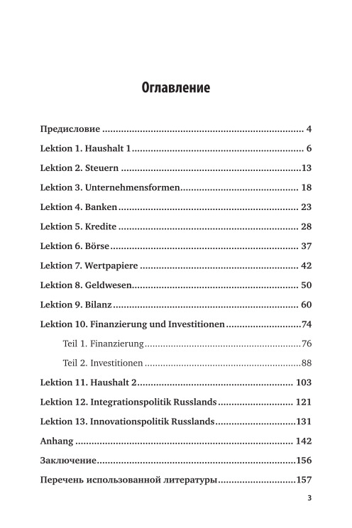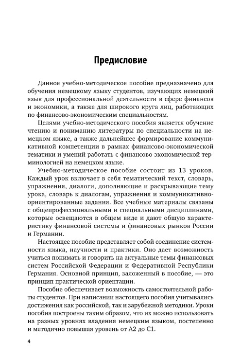 The manual will help students of bachelor's degree, master's degree and postgraduate students studying German for professional activity in the sphere of Finance and Economics, learn literature in the specialty of German. and also form a communicative competence within the framework of financial and economic subjects. At the heart of the manual is the principle of practical orientation, combining the system of language, science and practice. Each lesson includes thematic text, dictionary, exercises, dialogues that complement and reveal the topic of the lesson, dictionary to dialogs, exercises and communicative.