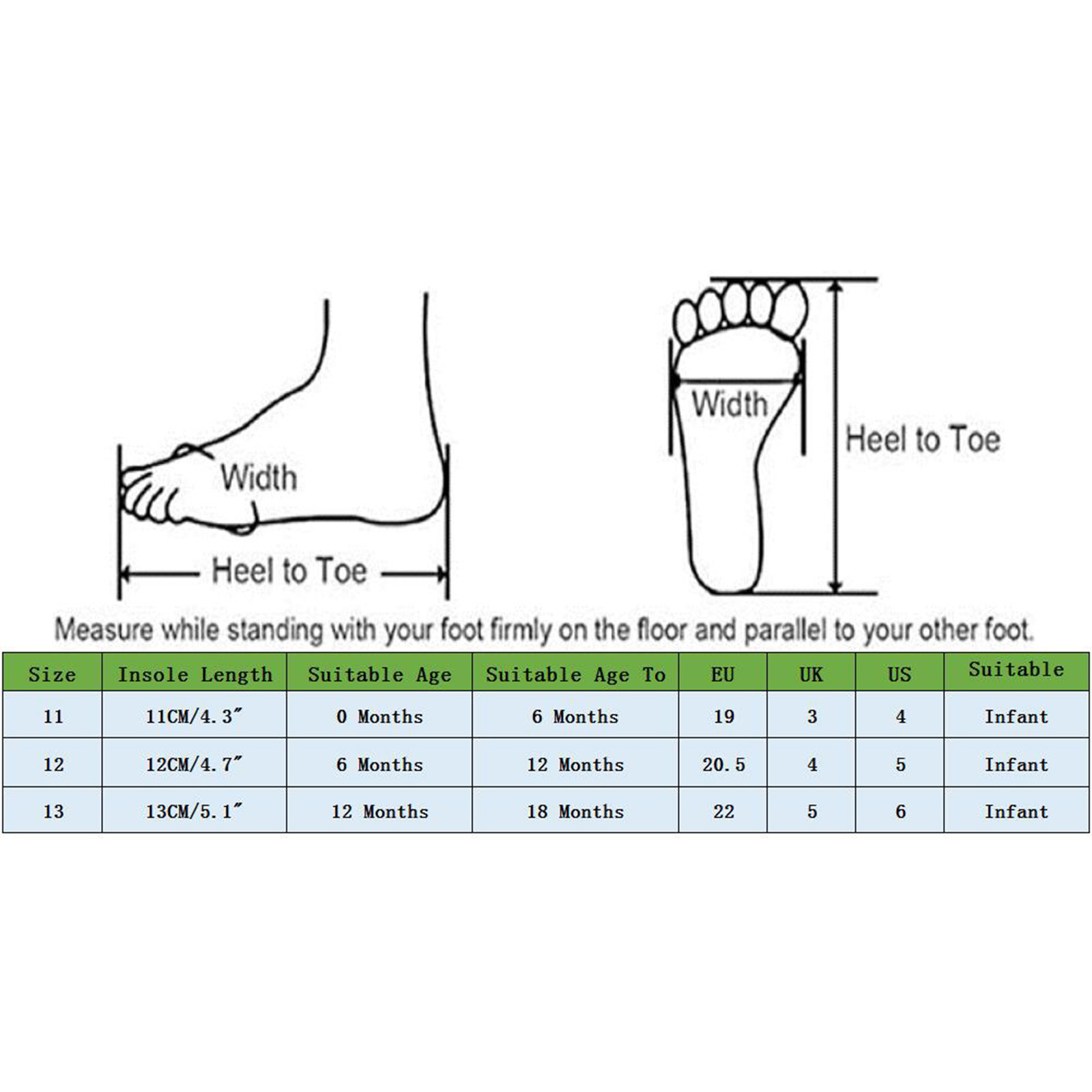 Размер: 12 | Стельки Длина: 12 см/4,7" | Подходящий возраст: 6 месяцев | Подходящий возраст: 12 месяцев | ЕС: 20,5 | Великобритания: 4 | США: 5 | Подходит для: младенцев |