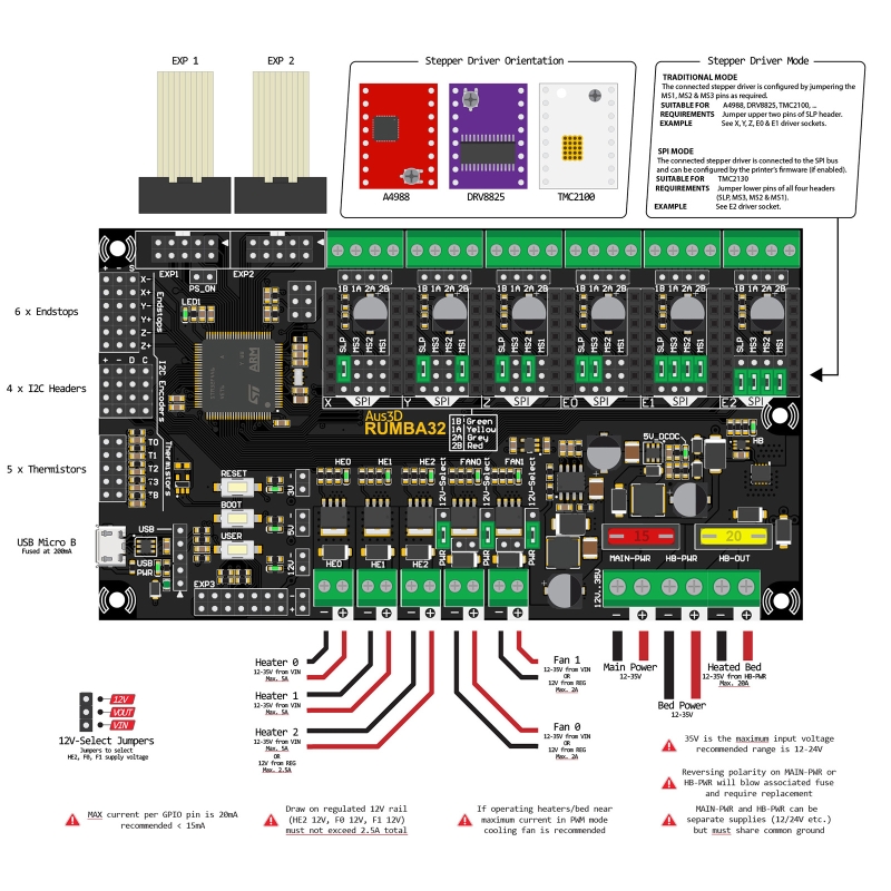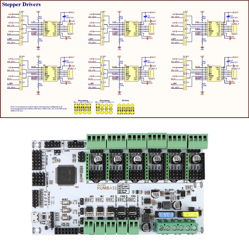 4. RUMBA32 поддерживает стандартные Шаговые драйверы, такие как A4988, DRV8825 и т. д., но также имеет дополнительную поддержку драйвера SPI: Просто измените перемычку под любым драйвером, И вы можете использовать Шаговые драйверы на основе SPI, например, TMC2130-no нужна дополнительная проводка!