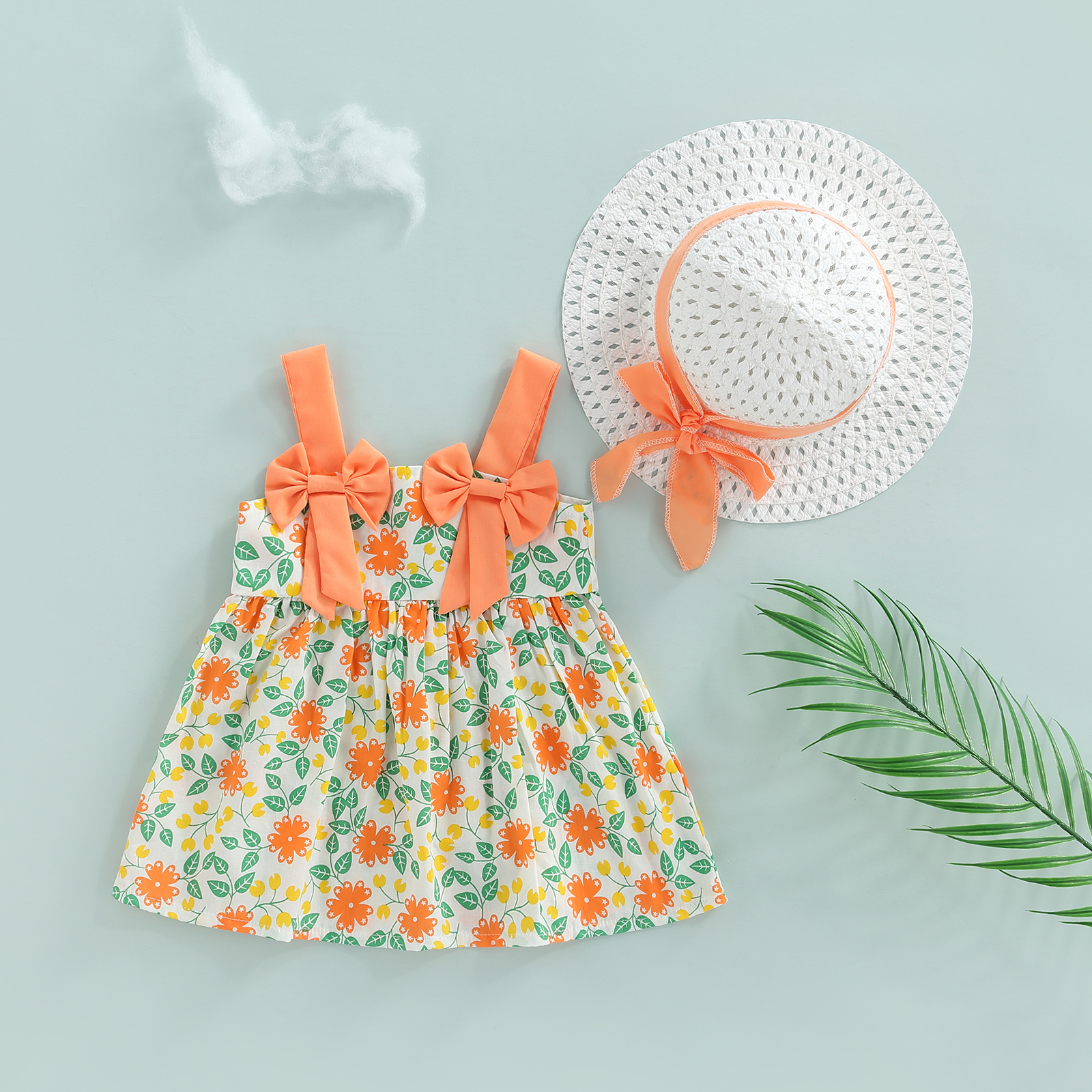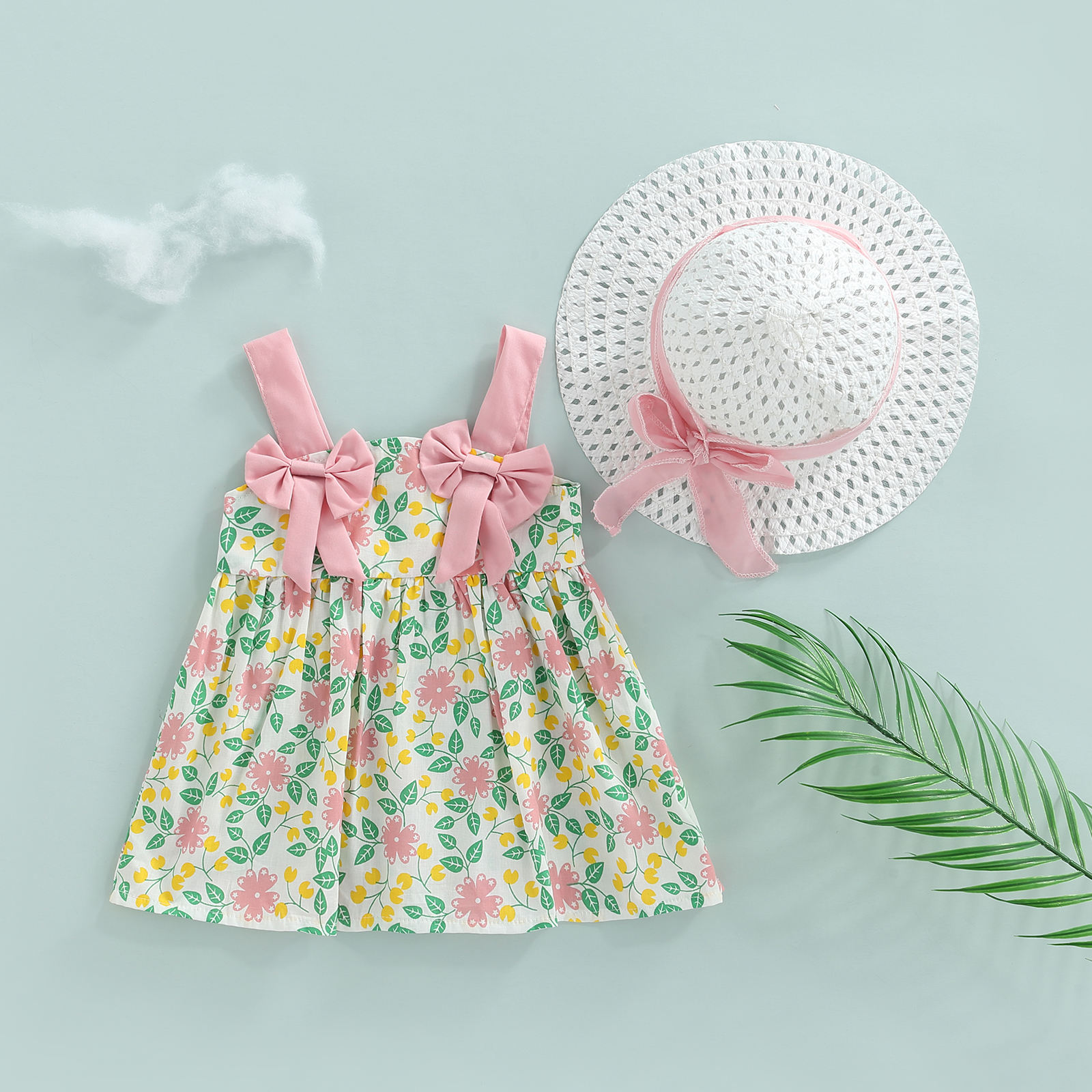 Платье на лямках для маленьких девочек с летней шапкой платье с цветочным принтом и соломенной шапочкой