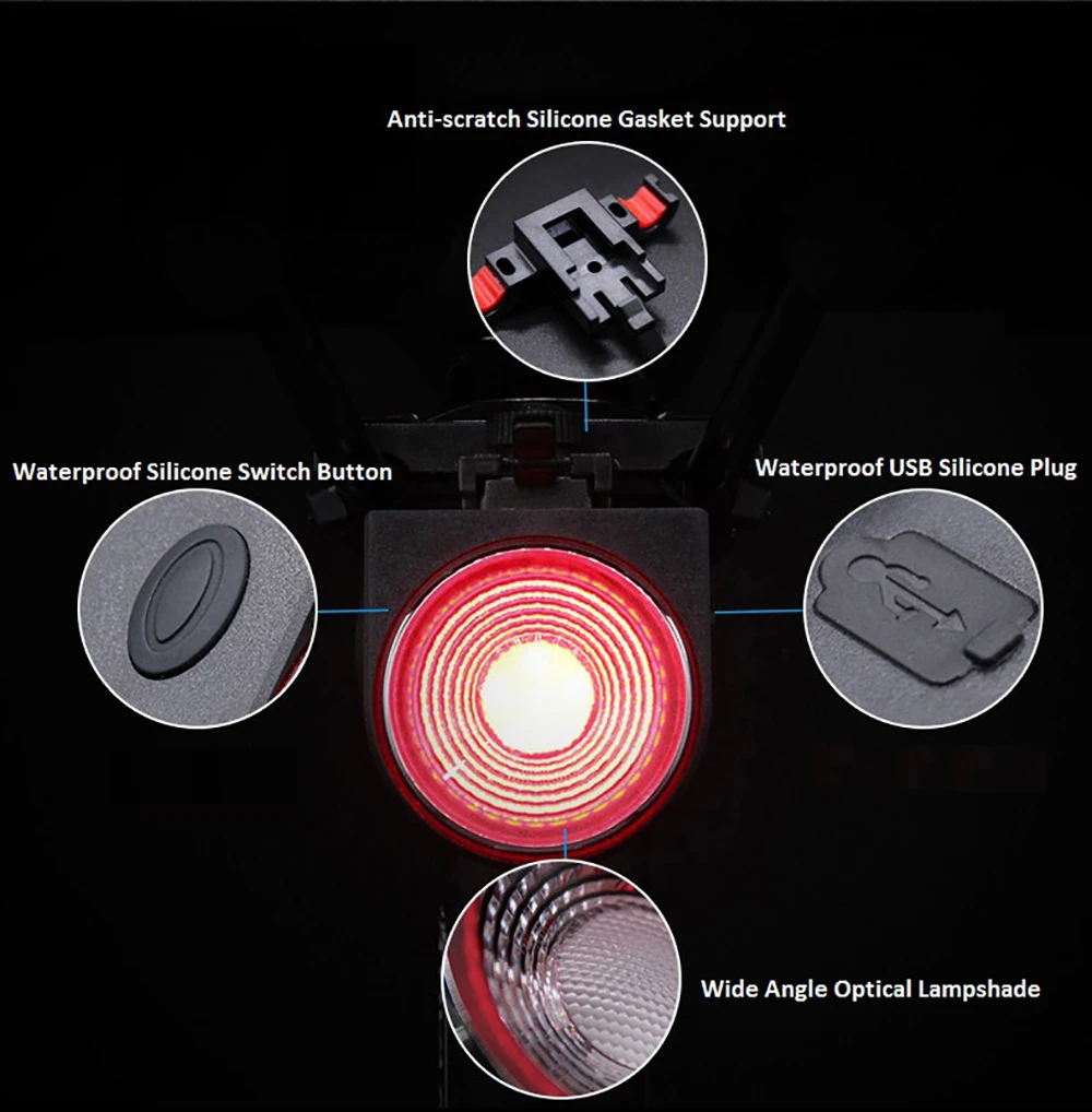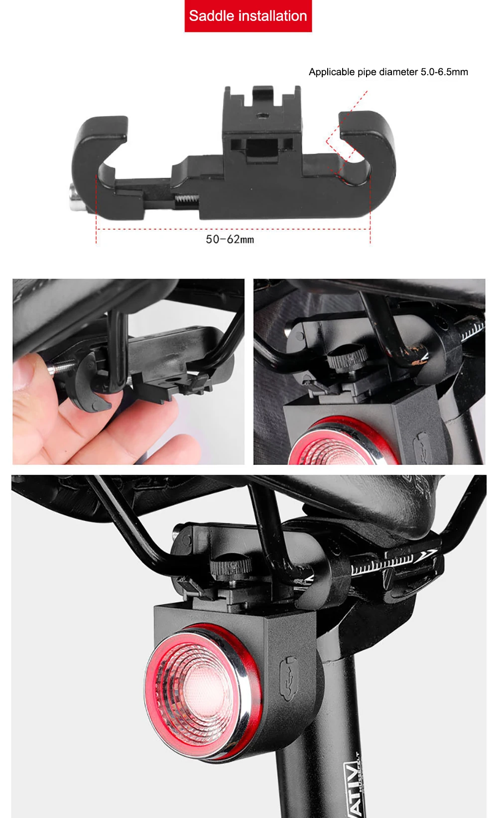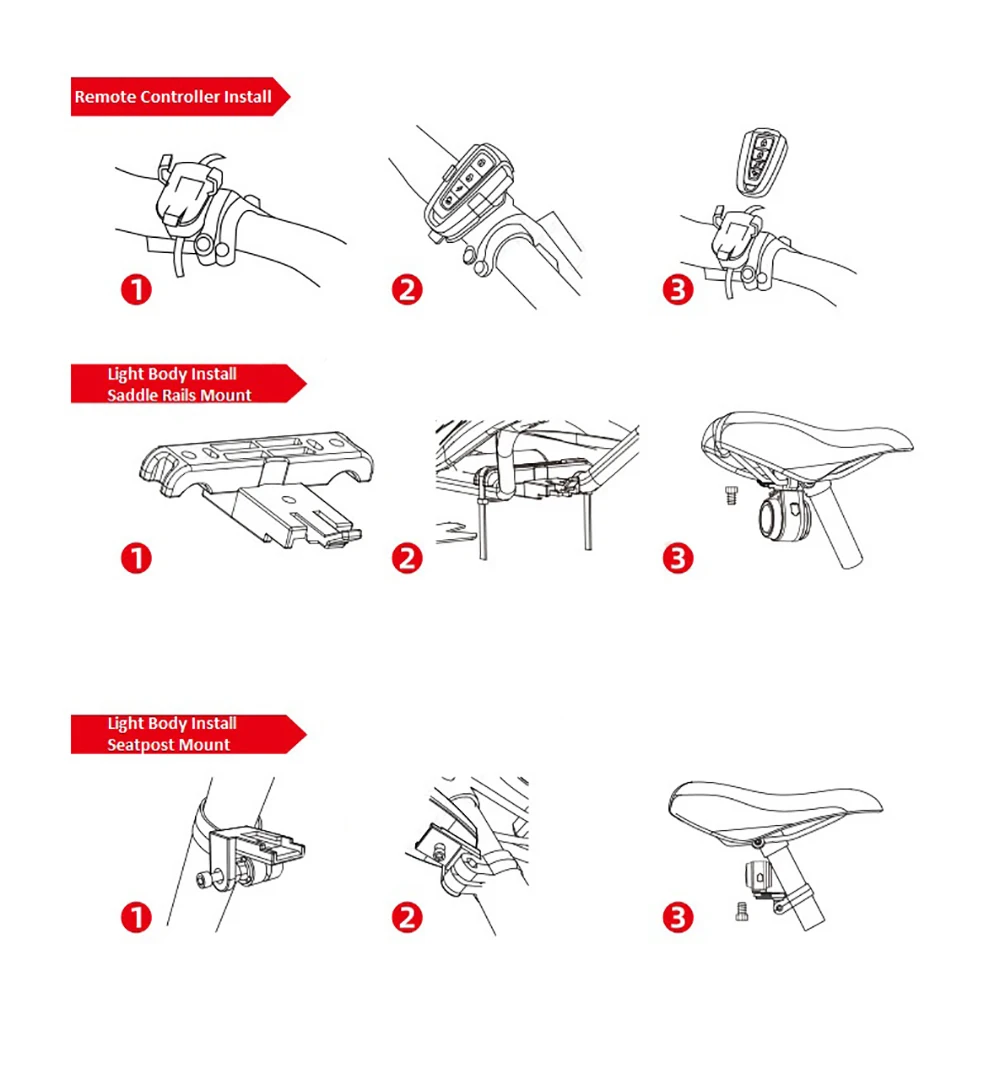 Аксессуары для продукта: задний светильник с дистанционным управлением и фиксированным базовым седлом, фиксированный кронштейн, руководство по эксплуатации, фиксатор для крепления кабеля на китайском и английском языках, usb-кабель для зарядки, инструменты и винты