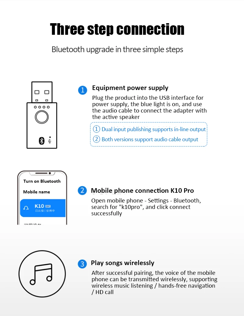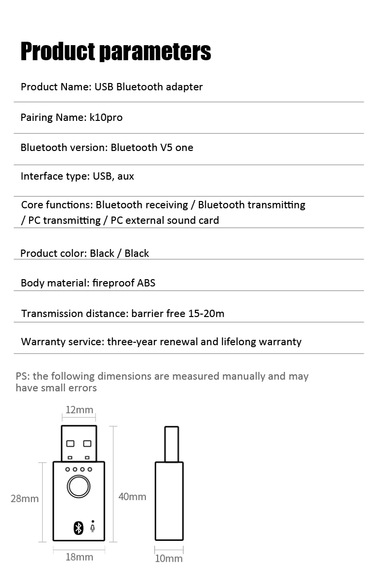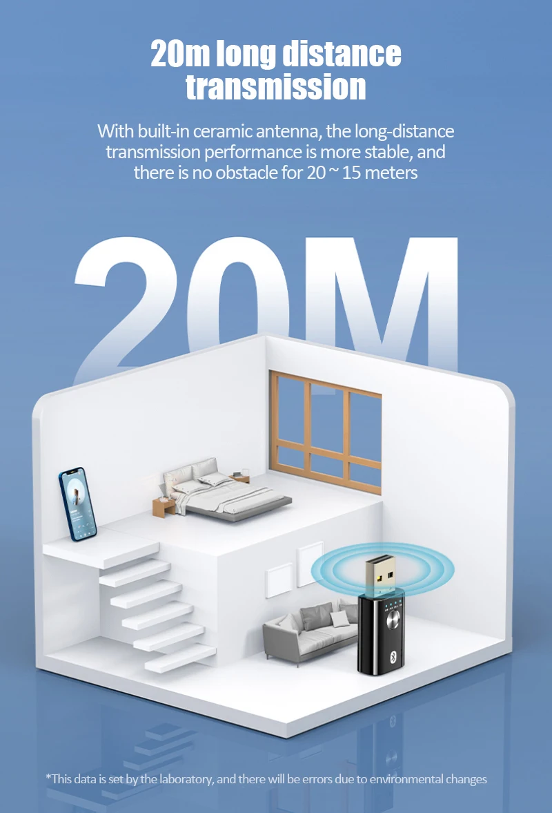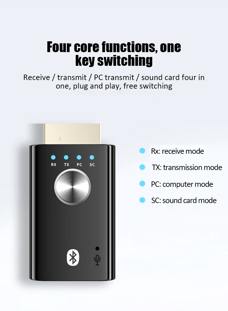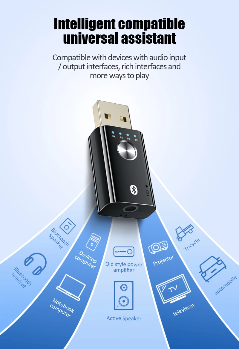 2. Режим аудиопередатчика ПК: Беспроводная передача звука с ПК, ноутбука на bluetooth-совместимую гарнитуру или динамик через порт USB, аудиокабель не требуется.