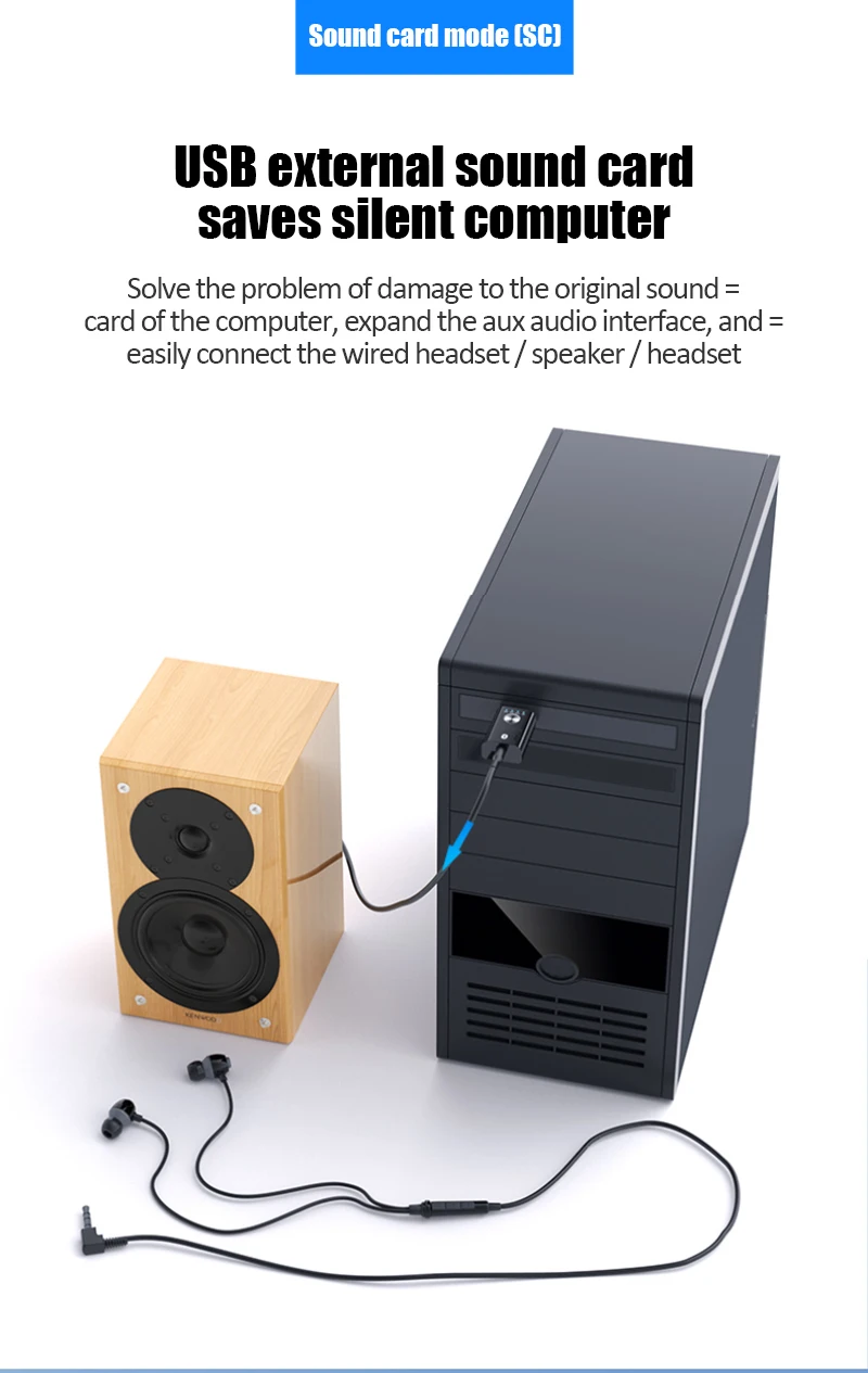 4. Режим звуковой карты (SC): внешняя звуковая карта USB, решить проблему повреждения оригинальной звуковой карты компьютера, расширить аудиоинтерфейс AUX, И легко подключить проводные наушники/колонки/гарнитуры.