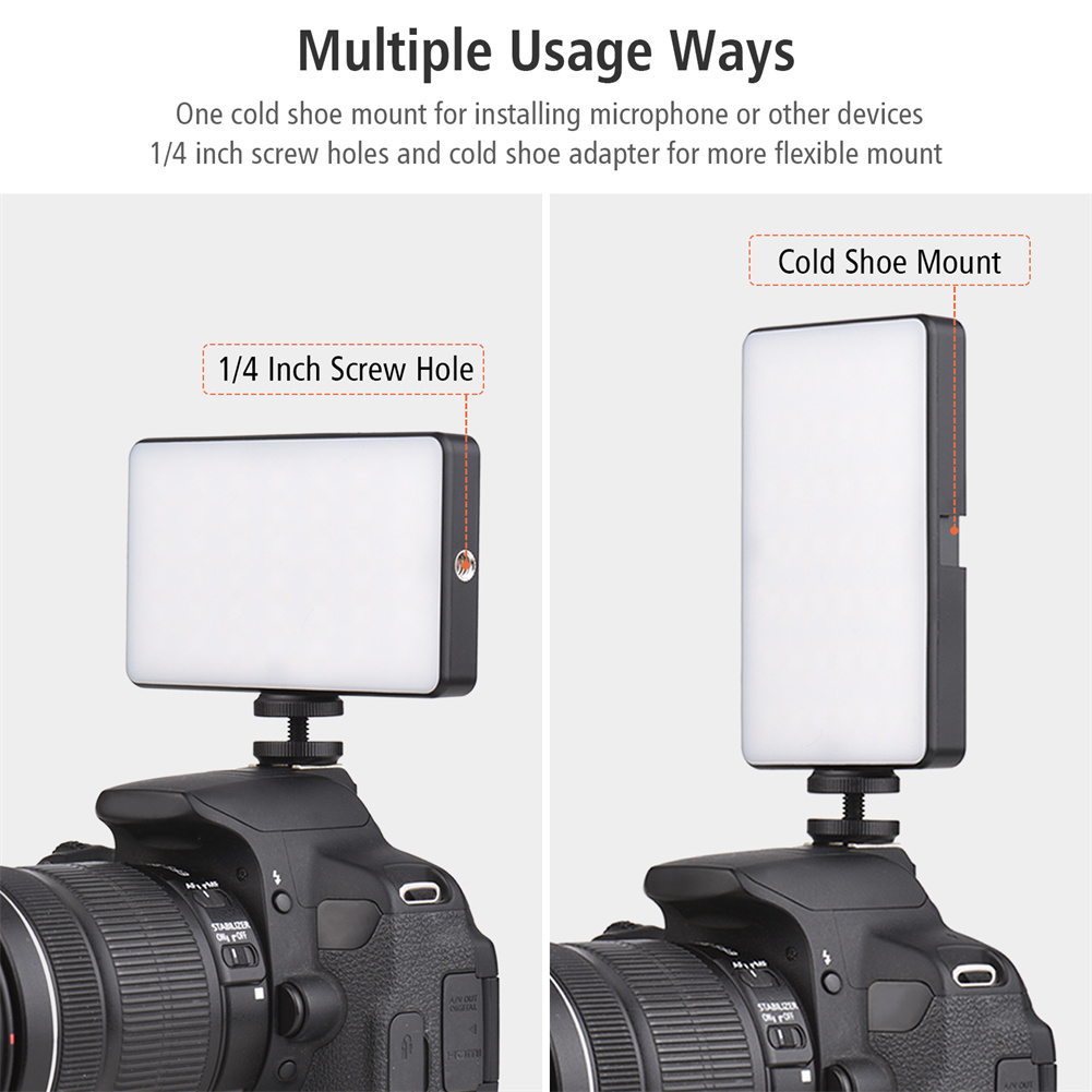 1. Многократное использование: поставляется с креплением для холодного башмака для крепления микрофона или другого оборудования; 1/4 "Нижняя и боковая резьба, плюс предоставленный адаптер для холодного башмака, позволяет легко прикрепить светодиодный светильник к камере, штативу или другим креплениям.
