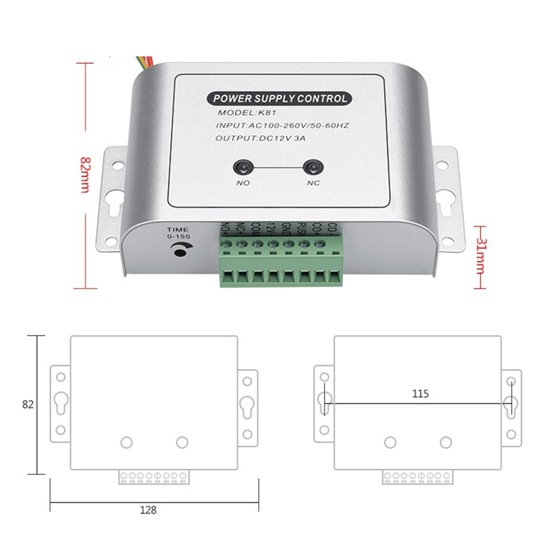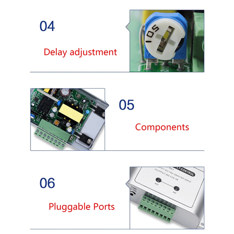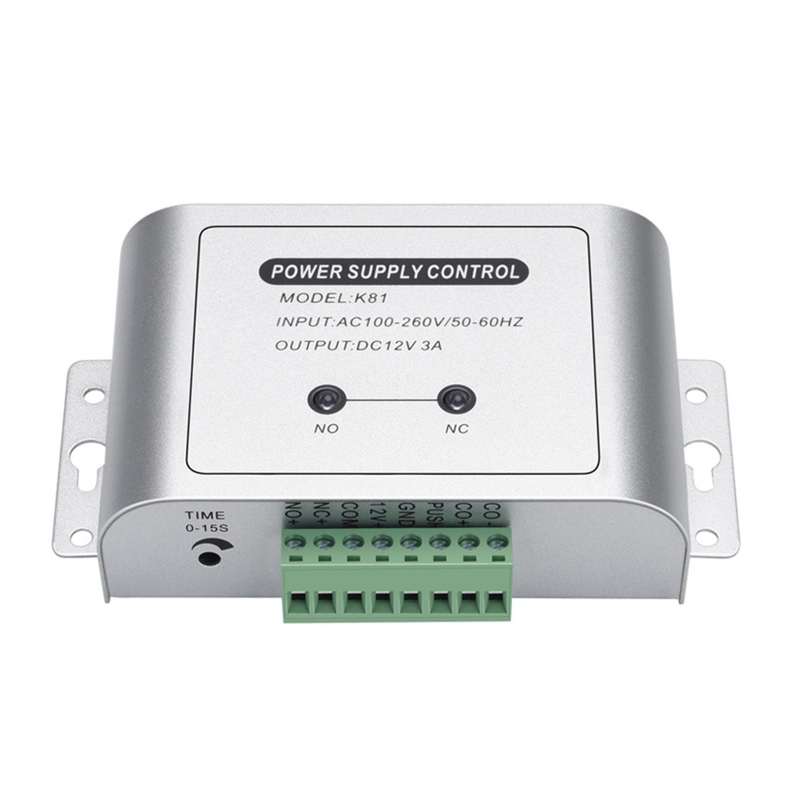 Отличная рабочая производительность. Поддержка, DC 12V 3A выходной ток, AC 100-260V входное напряжение. Установка NC / NO выходов, может управлять различными типами электрических замков, на основе цепи управления задержкой, время блокировки может быть в течение 0-15 секунд.