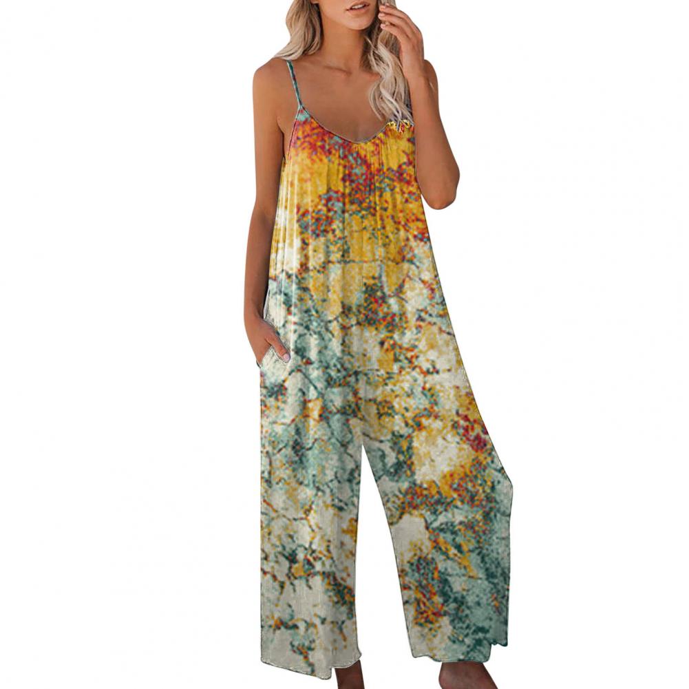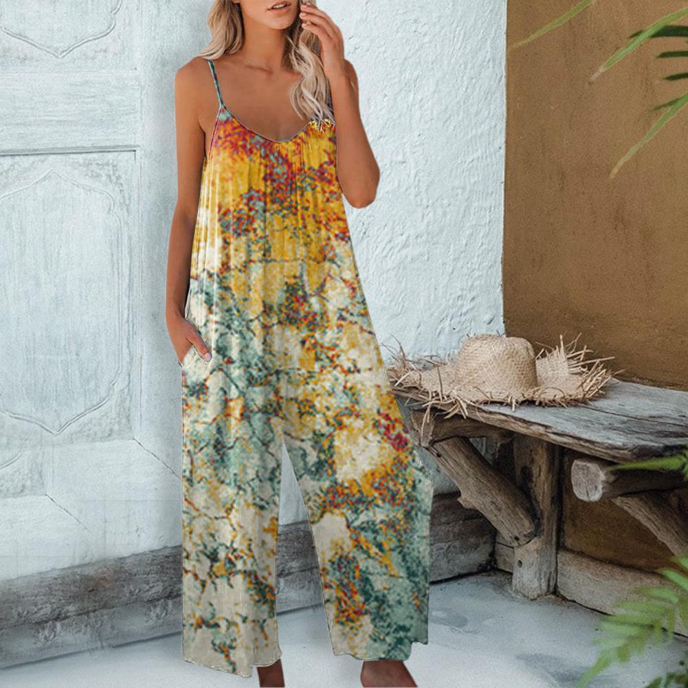 Пляжный комбинезон с модным принтом и открытой спиной, женский комбинезон на тонких бретелях с широкими штанинами, уличная одежда