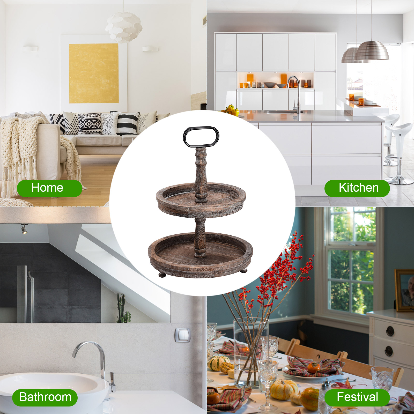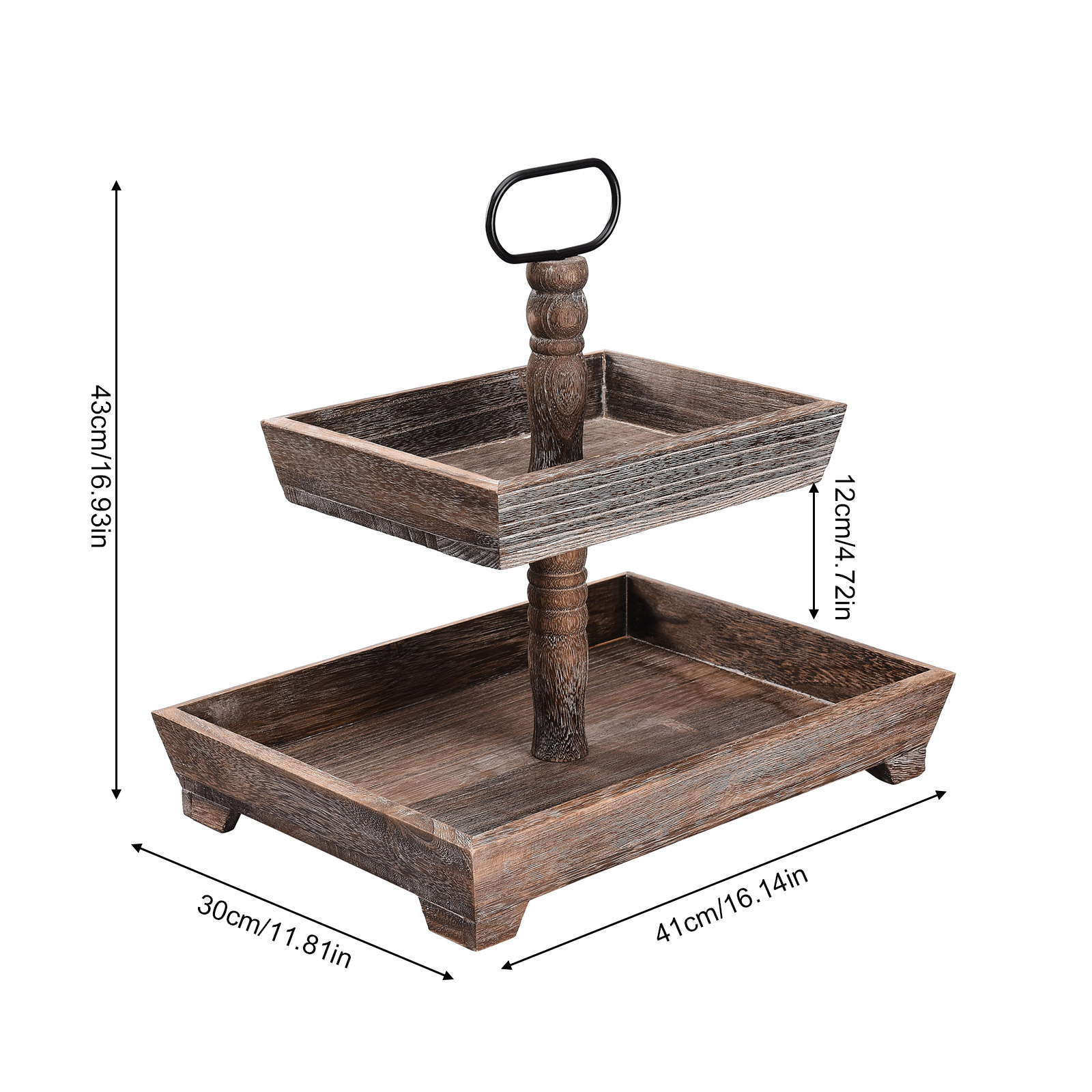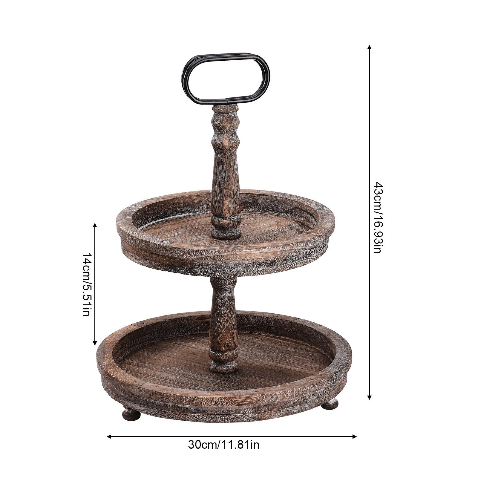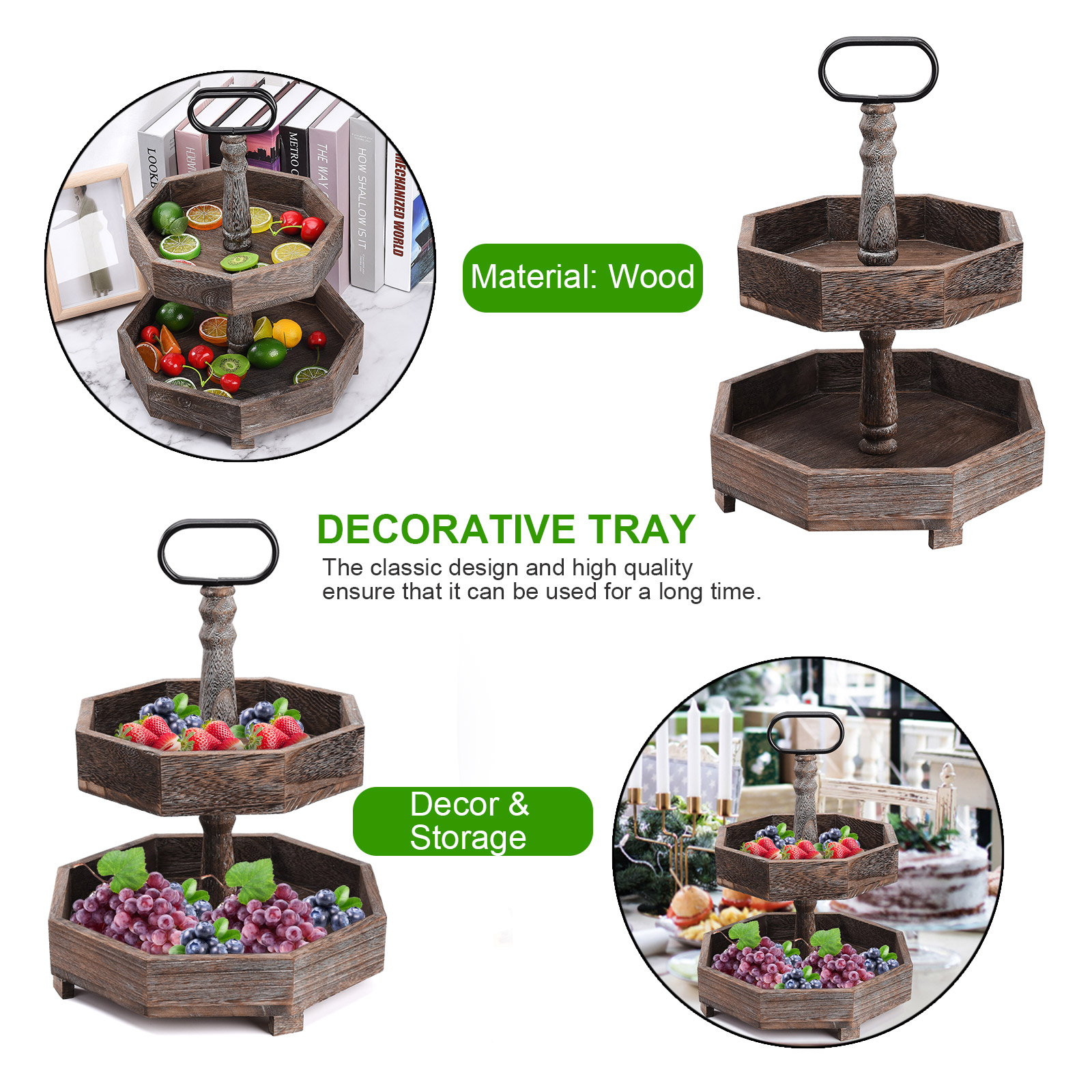 1. Декор и хранение: двухуровневый многоярусный многослойный поднос в деревенском стиле изготовлен из огорченного дерева, этот деревенский многоуровневый поднос можно разместить на кухне, прихожей, гостиной, журнальном столике и т. д. Этот деревянный поднос является прекрасным украшением и практичным инструментом для хранения.