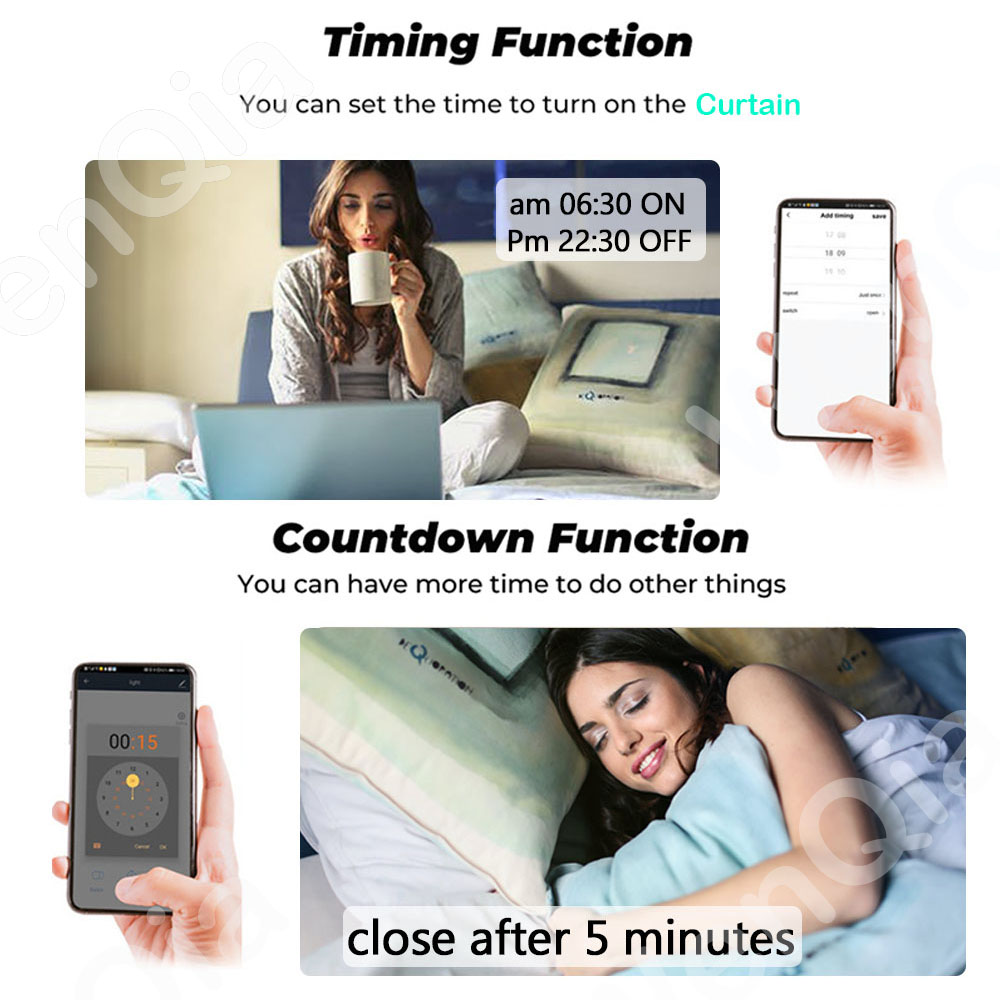 --Take full control of your roller blinds intelligently with the timer feature on your App,which enables to open / close them at a specific time automatically. Automate your home roller blinds via 3 timing types:schedules timing,countdown timing and loop timing.