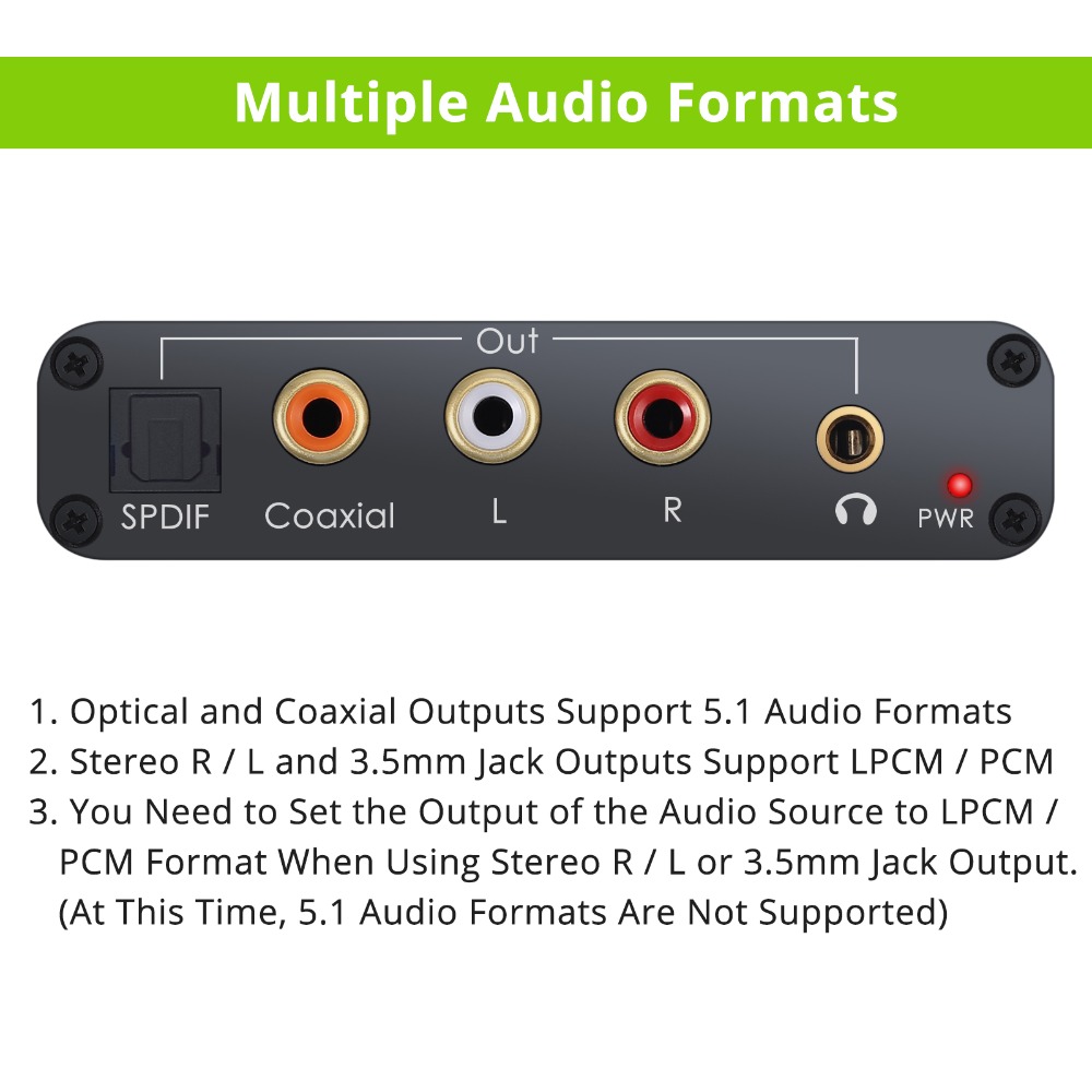 2. Цифро-аналоговый аудио конвертер, вы можете также использовать цифровой коаксиальный аудиокабель и оптическими портами в качестве источника сигнала вход для преобразования цифро-аналоговый аудио R / L, 3,5 мм выход.