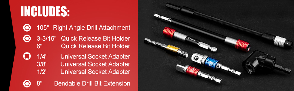 EZARC, комплект из 3 предметов, (7 шт./компл.) Гибкое сверло расширение комплект, включают в себя 105 ° дрель с прямым углом, 8 дюймов гибкие сверло удлинитель, система автоматического управления "2 предмета Quick Release держатель бит, 3 шт. 1/4" 3/8 "1/2" Ударная розетка адаптер