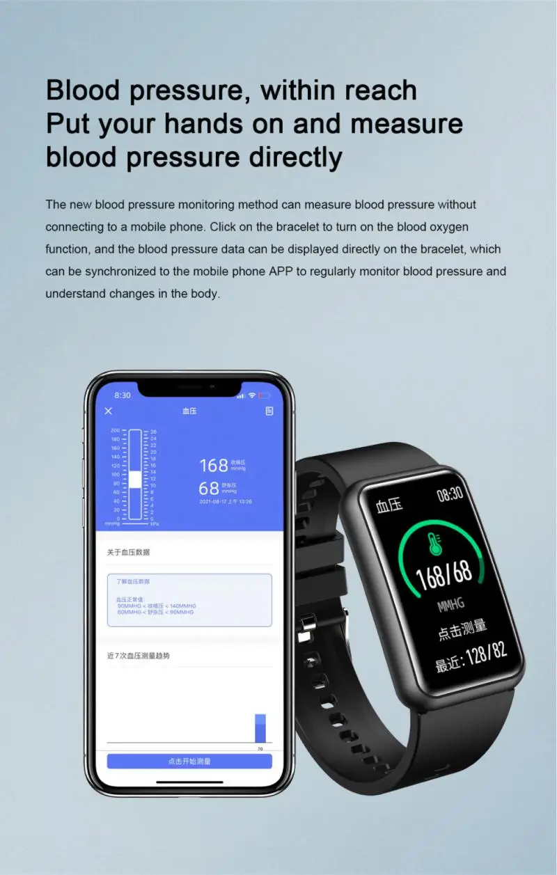 The new blood pressure monitoring method can measure blood pressure without connecting to a mobile phone. Tap on the bracelet to turn on the blood oxygen function, and the blood pressure data can be displayed directly on the bracelet, which can be synchronized to the mobile phone APP to regularly monitor blood pressure and understand changes in the body.