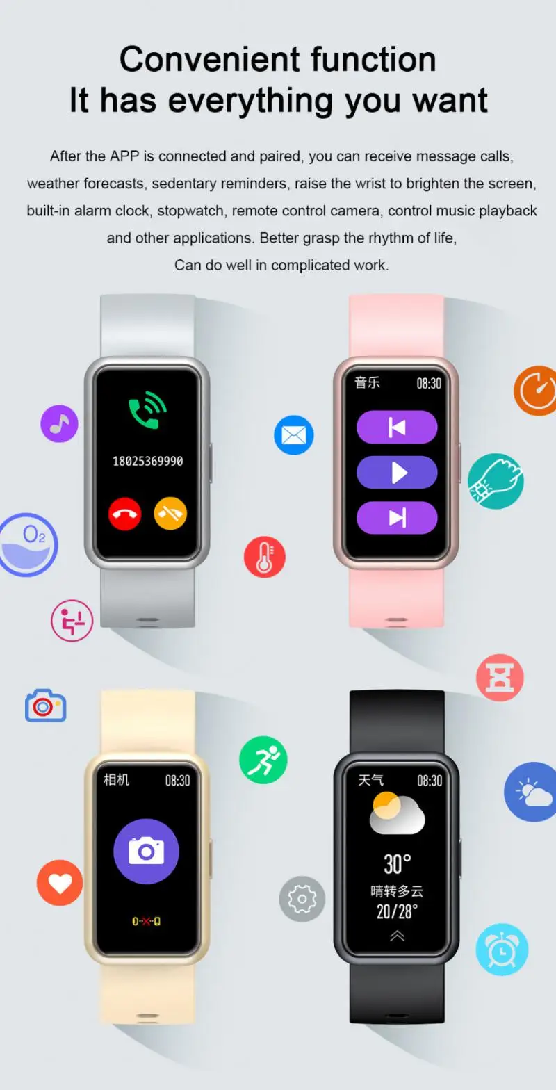 After the APP is connected and paired, you can receive message calls, weather forecasts, sedentary reminders, raise the wrist to brighten the screen, built-in alarm clock, stopwatch, remote control camera, control music playback and other applications. Better grasp the rhythm of life, and be able to do well in complicated work.