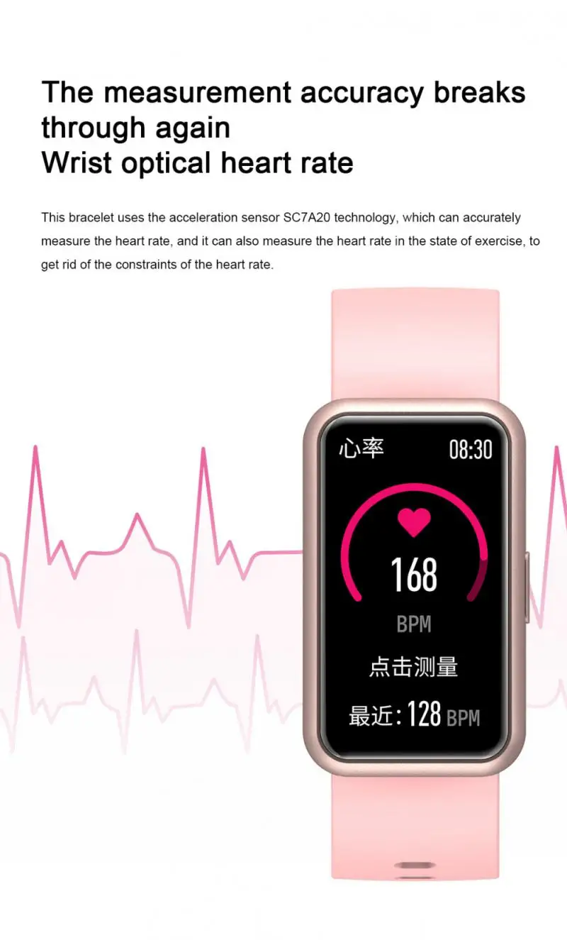 This bracelet uses the acceleration sensor SC7A20 technology, which can accurately measure the heart rate, and it can also measure the heart rate in the state of exercise, to get rid of the constraints of the heart rate.