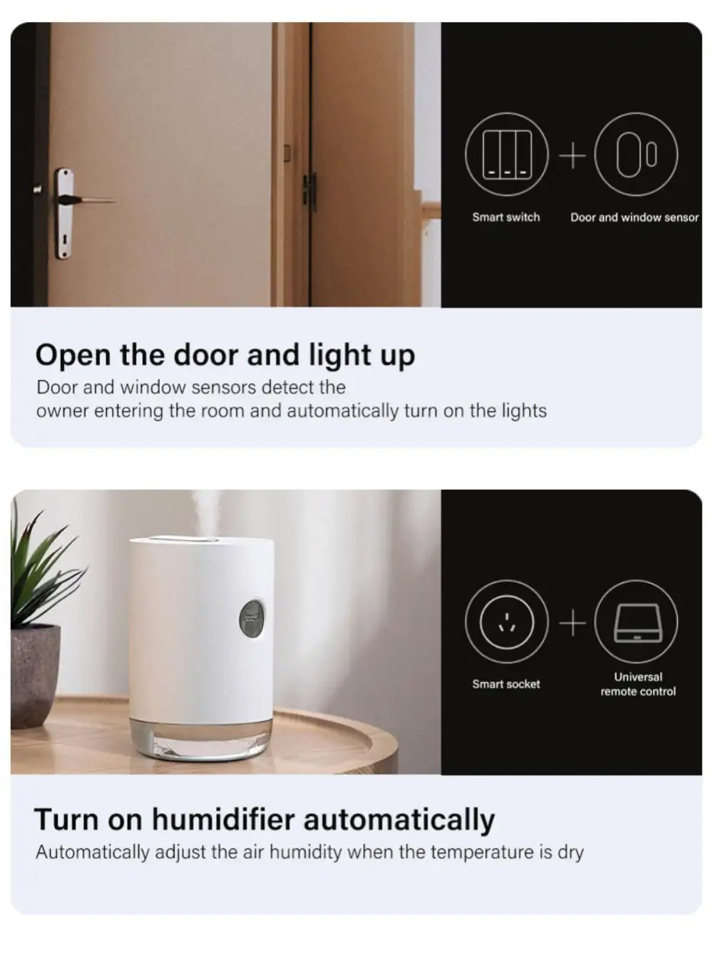 Через настройки, он может быть соединен с другими умными сценами, чтобы сделать жизнь умнее; Например, установите домашнюю сцену: автоматически Включите свет гостиной, телевизор и кондиционер.