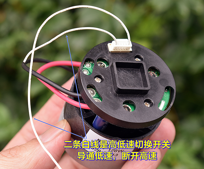 The driver board of this brushless fan also has a 6P socket, which has terminal wiring definitions. This batch of fans is equipped with a plug, but there are only two white wires on the plug. This is a high and low speed switch. When the two white wires are disconnected, the fan runs at the highest speed. When the two white wires are connected, the fan runs at low speed, reducing the power by about half. This batch of fans can operate at the highest speed by only connecting the positive and negative poles (red wire to positive pole, black wire to negative pole). The 6P socket has the functions of starting/stopping and speed gear switching, but without wiring, it does not affect the normal operation of the fans.