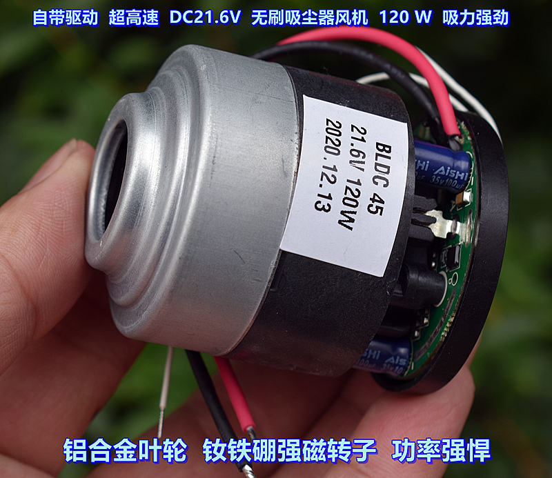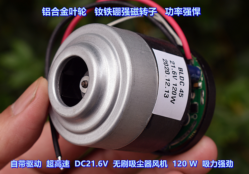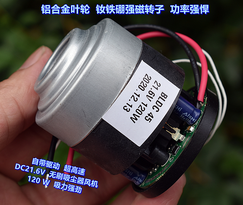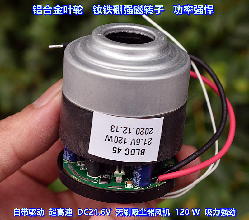 We have a brand new ultra high speed brushless vacuum cleaner fan in stock, which comes with a brushless drive plate and is suitable for voltages ranging from DC21.6V to DC24V. The inner rotor of neodymium iron boron high strength magnet and precision aluminum alloy impeller cannot be tested at the moment, but the estimated speed is nearly 100000 revolutions. The current at DC21.6V is 5.9A, the power rate is 120W, and the current at DC24V is about 5.2A, and the power is about 120W. Although the size is small, the suction force is strong, It is a brushless fan used in high-end micro vacuum cleaners. This fan can operate by only connecting the positive and negative poles, which is very convenient to use. The red wire is connected to the positive pole, the black wire is connected to the negative pole, and the positive and negative poles are strictly prohibited from being connected in reverse. This batch of brushless fans also has a 6P small socket equipped with a plug, but the plug only comes with two white wires. This is a high and low speed switch. When the two white wires are suspended and disconnected, the fan runs at the highest speed. When the two white wires are connected, the fan runs slowly (the current is reduced by half).