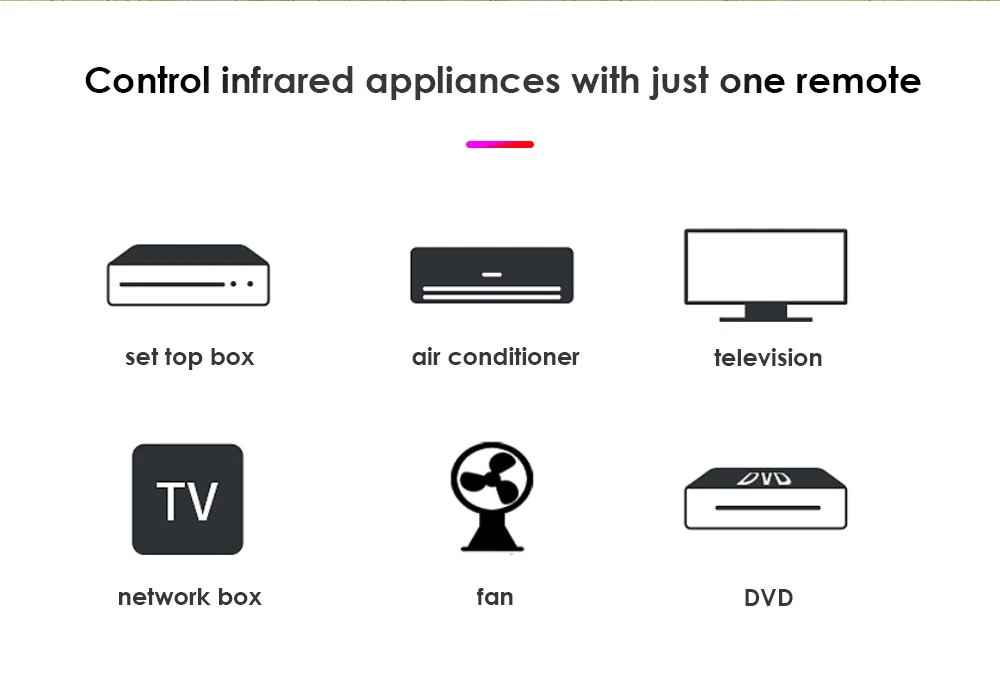 С помощью этого универсального ИК-пульта дистанционного управления вы можете использовать ваш смартфон для управления бытовой техникой, такой как STB (телеприставка), ТВ-приставка, телевизор, кондиционер, вентилятор, DVD и т. Д. Совместимость с большинством брендов, для получения подробной информации, пожалуйста, обратитесь к списку поддерживаемых брендов в приложении. Кроме того, он имеет функцию обучения, позволяет Копировать функцию ключа дистанционного управления в приложение.