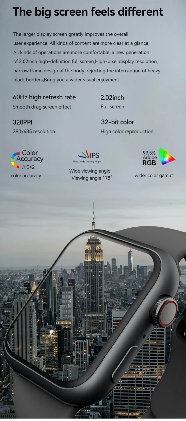 4. Экран: HD IPS, 240*285 пикселей 2.5D изогнутый полный сенсорный экран, разрешение 320x380