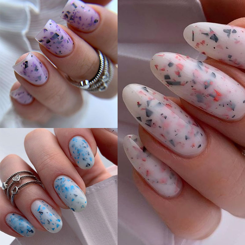 2. Равномерно посыпьте хлопья на ноготь и закрепите.