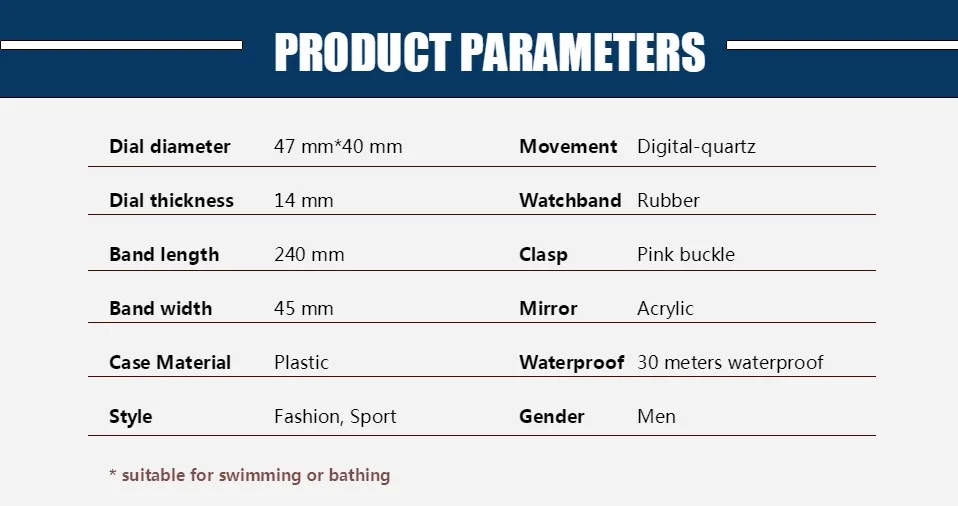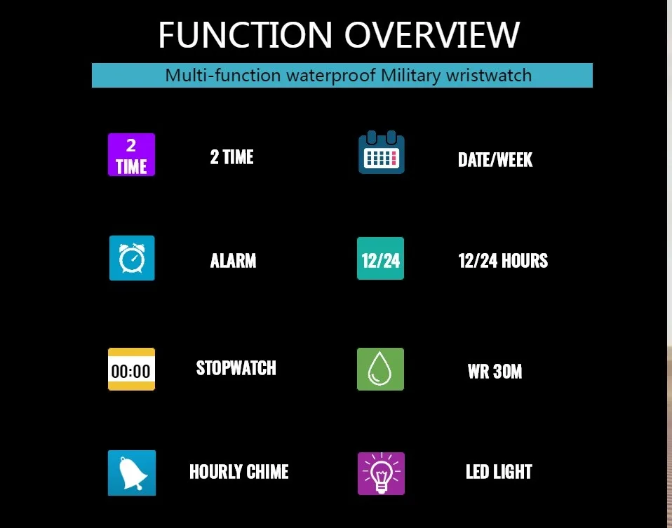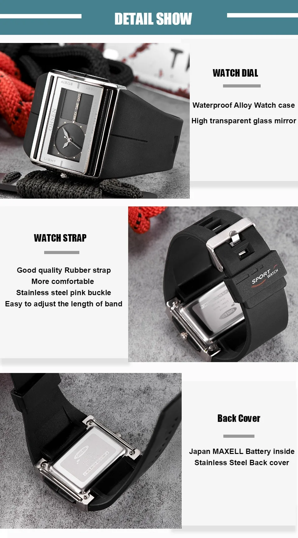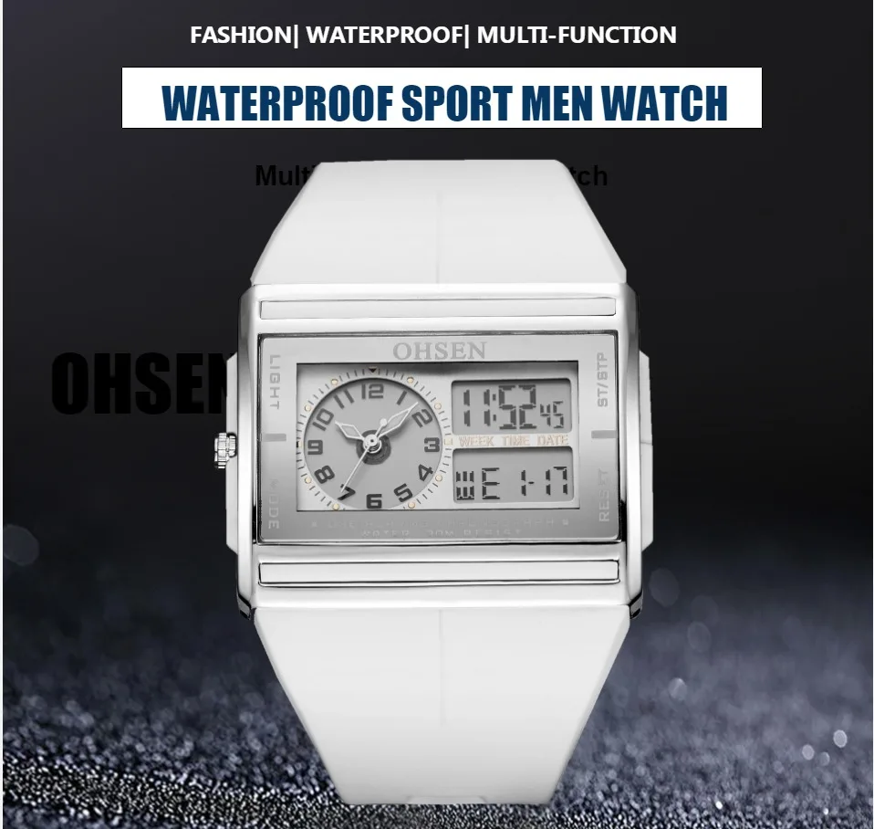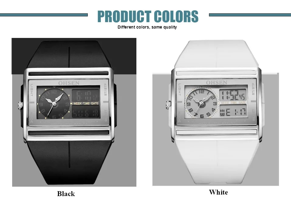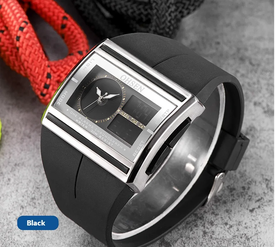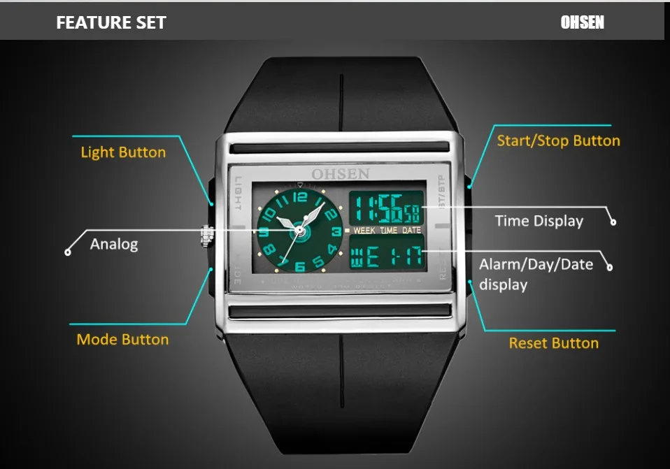 Название брендаohsenНомер моделиAD0518СтильМодный и повседневныйТип товараКварцевые наручные часыВозможностиСигнализацияВозможностиПодсветкаВозможностиВодонепроницаемыйВозможностиМножество часовых поясовВозможностиХронографВозможностиУдаропрочныйВозможностиСекундомер с остановомВозможностиПолный календарьВозможностиПлаватьВозможностиАвтоматическая настройка времениВозможностиСветодиодная индикацияМеханизмQUARTZДиаметр циферблата47Материал корпусаСплавТип материала окошка циферблатаХардлексФорма корпусаRectangleГлубина водонепроницаемости3 БарТип материала браслетаРезинаШирина браслета26Длина ремешка24Тип застежкиПряжкаМатериал коробки и корпусаБез упаковкиЧехол толщина14Единица измерения100000015Количество1