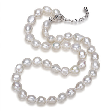 Add classy elegance to any formal outfit with this Freshwater Cultured Pearl Necklace. The classic single strand Necklace features baroque shaped freshwater Handpicked natural white color pearls on an adjustable clasp to assure the perfect fit. The pearls have variable uniformity and good luster, each measuring 9-10mm millimeters wide. The baroque shape of these simple pearls create a heirloom-quality piece that you'll want to wear for years to come. Pair this delicate Necklace with your favorite little black dress for a look that will turn heads wherever you go. We only source the highest quality pearls for our Necklace.