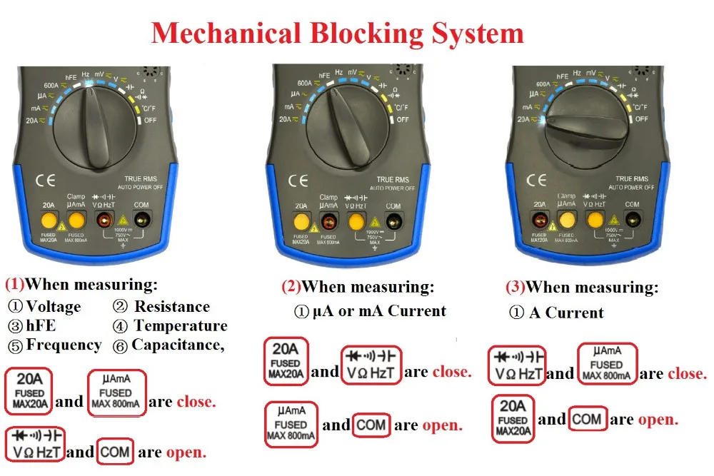 Автомобильный диапазон Тест напряжения постоянного/переменного тока Тест постоянного/переменного тока Сопротивление/Емкость/частота/температура/испытание рабочего цикла Тестовый диод/hFE Тест Непрерывный зуммер Функциональная индикаторная лампа Mechaniacal блокирующая система Задний светильник Автоматическое отключение Хранение данных Относительное значение