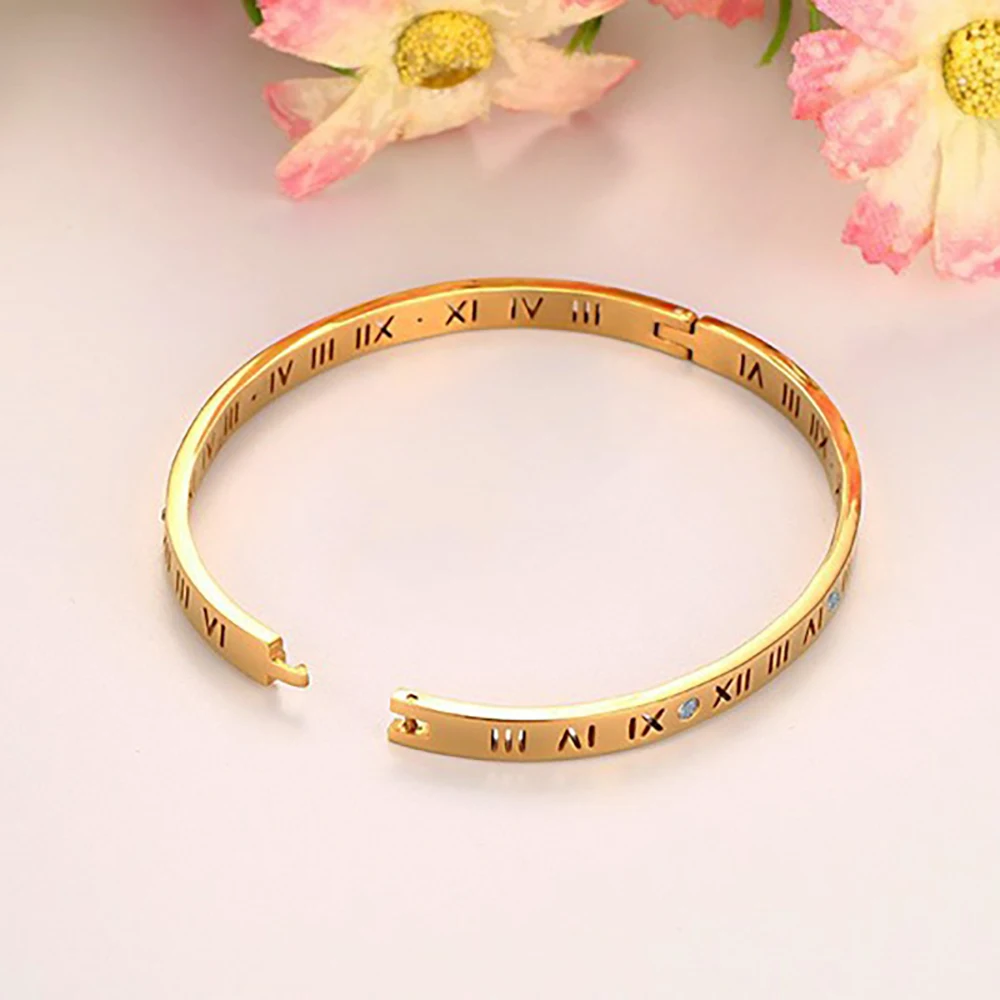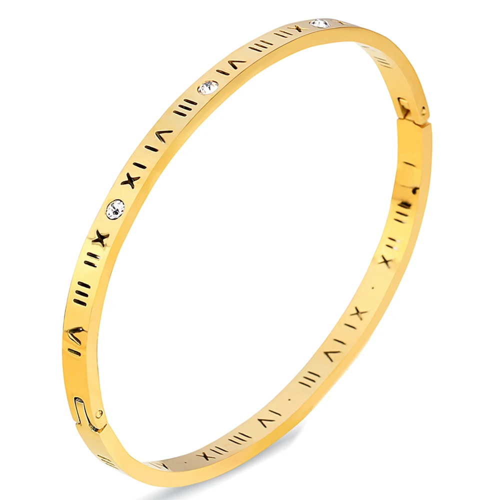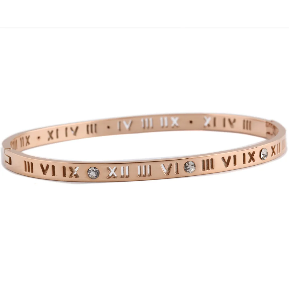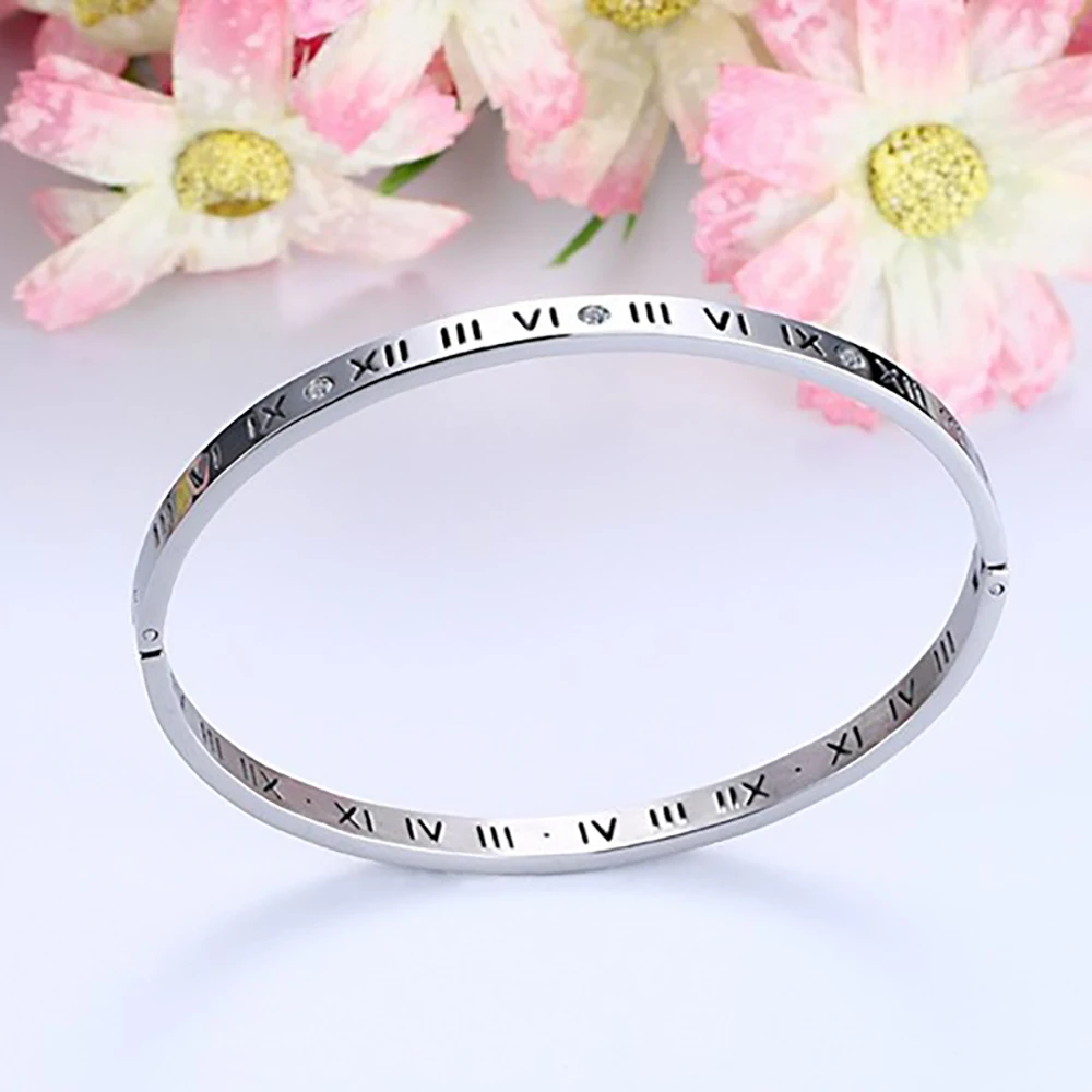 Roman numeral design Cuff Bangle Stainless Steel women Fashion Bracelet Crystals