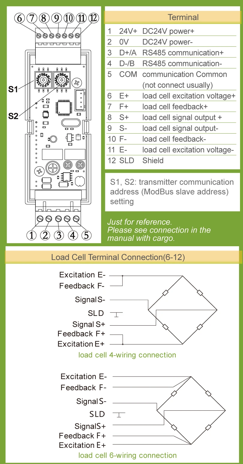 Четыре проводки предназначены для подключения ячейки нагрузки, E +, E-, S +, S-, не включая щит ячейки нагрузки.