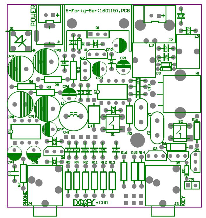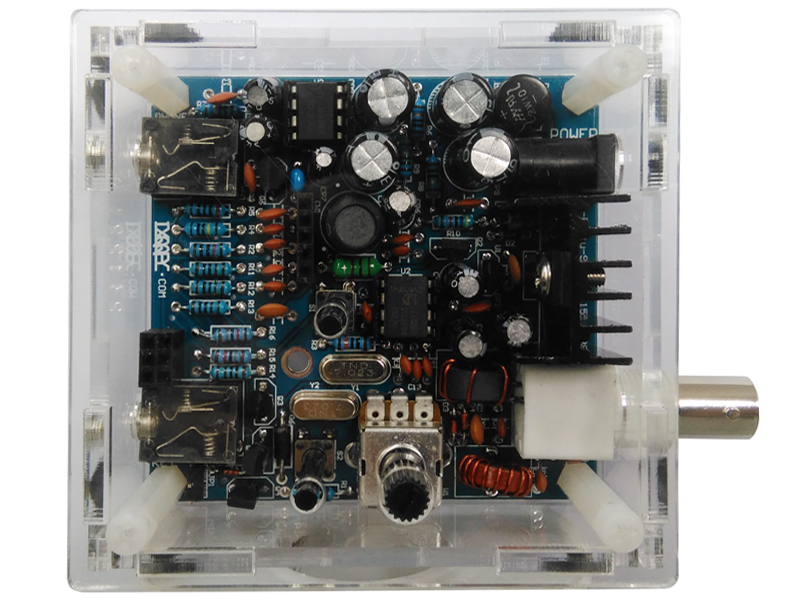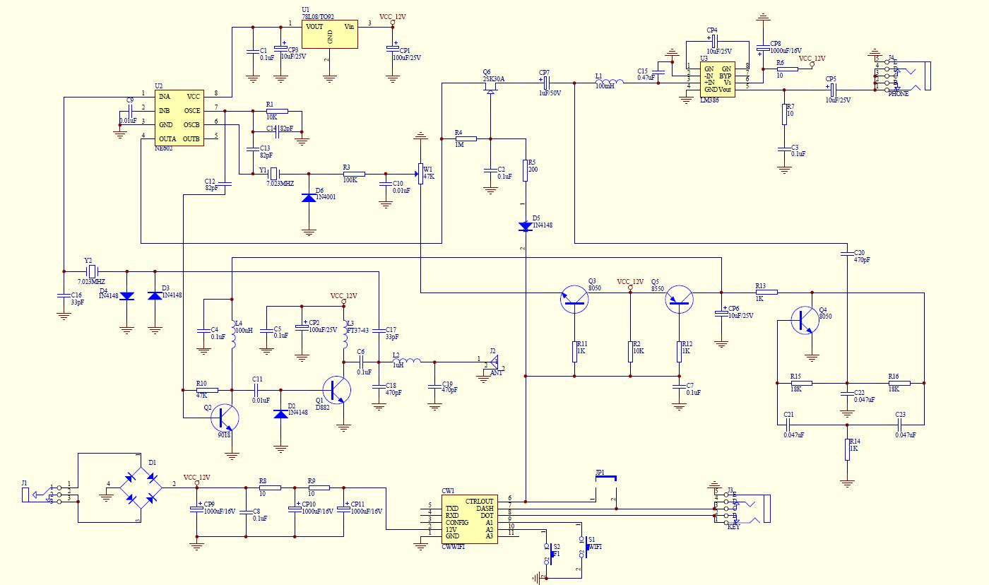 1. Introduction This is a very small volume of the 40 meter band simple micro-power amplitude telegraph transceiver, a 12V DC power supply, the spread better, they can and nearby provinces, hundreds of kilometers of amateur radio communication. "S-Forty-9er" LXQQFY.com launched by the principle reference to the US NorCal QRP Club famous "Forty-9er" kit, support WIFI module can be configured to monitor data communication with the mobile phone APP added automatic key function, automatic transmitter function display transmitter timing, and design a housing assembly, excellent performance, nice, convenient and practical. 2, the main indicators Power: 12V (recommended linear battery or power supply) Antenna: 50 ohm, unbalanced Receiving Quiescent Current: 20mA Emission current: 400mA Transmitting power: 3W Frequency: The oscillator frequency emission: 7023KHz; receiving local oscillator frequency: about 7023-7026KHz Mode: CW Key: manual key and automatic key Automatic Identification Automatic transmitter: Support Configuration: Mobile APP using WIFI communication (comes hot) Shell: assembly, all-inclusive 3, the circuit schematic Referring schematic drawings, is a core part of the receiving NE602, which includes an internal oscillator circuit and a balanced mixer, the incoming signal through the antenna after a crystal filter, into the mixer, the oscillator circuit in the reception frequency oscillation, after mixing the two signals, the audio directly to the audio frequency signal CW, NE602 output again to the LM386 amplification, thus completing the entire receiving process. Therefore, direct RF signal is mixed into the audio receiver is called "DC receiver", DC direct conversion means. Audio oscillator circuit generating sine Q4 constitute sidetone of approximately 700Hz, gave LM386 amplification, so that the headset follow-ahead to produce "Didi blah" audio. Emitting portion utilizes the oscillation circuit NE602, and then to do the buffer amplifier Q6, the final stage is Class C amplifier constituted by the D882, the amplified high-frequency signal after LPF filter connected antenna. Phone WIFI module is an optional module of the suite, if you do not need to use the module shorted JP1, the S-Forty-9er Forty-9er with the same function, only to become an ordinary radio support manual key. If you use this module you need to disconnect JP1 (attention required), the S-Forty-9er through WIFI APP communication with the phone, the radio's built-in configuration code to support automatic key to display the transmitter timing. 4, component selection 8050 magnification selection around 130, D882 magnification select 200 or so. L3 is a high frequency choke, using the 0.5 mm enameled wire around the 11 laps FT37-43 ferrite bead (black) on. L2 is a high frequency filter inductor, using 0.5 mm enameled wire around the 16 laps T37-2 toroid core of iron (red) on. 100uH inductors are fixed as color ring inductance, 100mH inductor cylinder fixed inductor (Outsourcing black heat shrink tubing). Other devices such as 0.47uF capacitance monolithic capacitors, larger than 10uF capacitance of aluminum electrolytic capacitors, all resistance is 1 / 4W fixed resistors. 5, production 5.1, referring to the original list, an inventory of the original device. Ready electric iron, solder, a multimeter and other tools. In the height of the welding device from low to high order, intended to build order: Resistors -> Diodes -> capacitor -> transistor -> Crystal -> bridge rectifier -> Electrolytic capacitor -> Chipset -> inductor -> magnet -> D882 -> other devices. S-Forty-9er is a new CW kit (reference time February 27, 2016), visit www.lxqqfy.com for the latest information. Note: Use WIFI module case must disconnect JP1 (unplug the jumpers) S-Forty-9er has the following characteristics: 1, the standard transparent shell. 2, should be widely Hello everyone requested, change the vertical resistors, diodes vertical, horizontal resistance, horizontal diode (down welding), the device is easy to solve the vertical short-circuit problem. 3, a high-end potentiometer to adjust the beat frequency is no longer necessary tools, direct manual adjustment. 4, increase the WIFI module supports, as an option, without the use of WIFI module, the functional equivalent of the old "Forty-9er" radio. 5, the case of using WIFI module, the internal support groups automatically launch code, the presence of radio stations, a key launch. 6, the lower case using WIFI module, support for automatic key and manual key intelligent switching and provide fully automatic mode, semi-automatic mode two operating modes. 7, the case of using WIFI module case, you can connect the phone (mobile application downloaded from www.lxqqfy.com), configuration parameters through the phone. 8, the mobile application can identify the station transmitting the content code, respectively, timing, Morse code, the letters displayed in three ways, the equivalent of transmitters to learn the function.