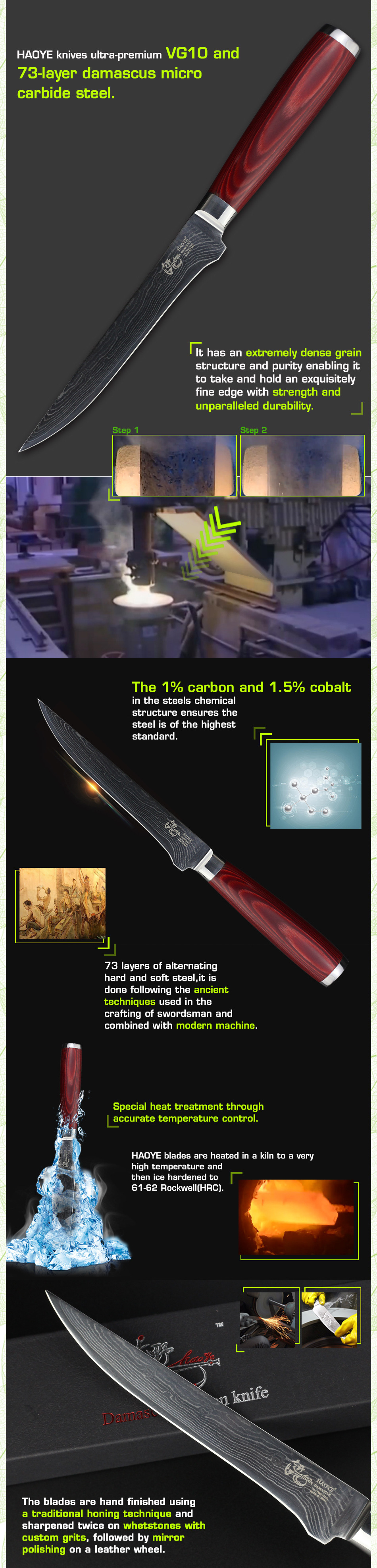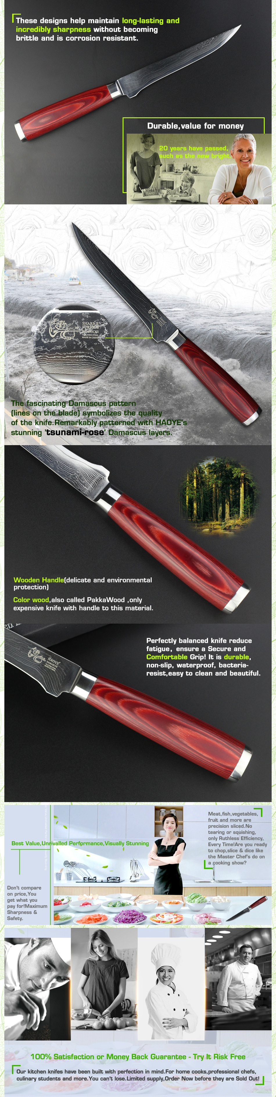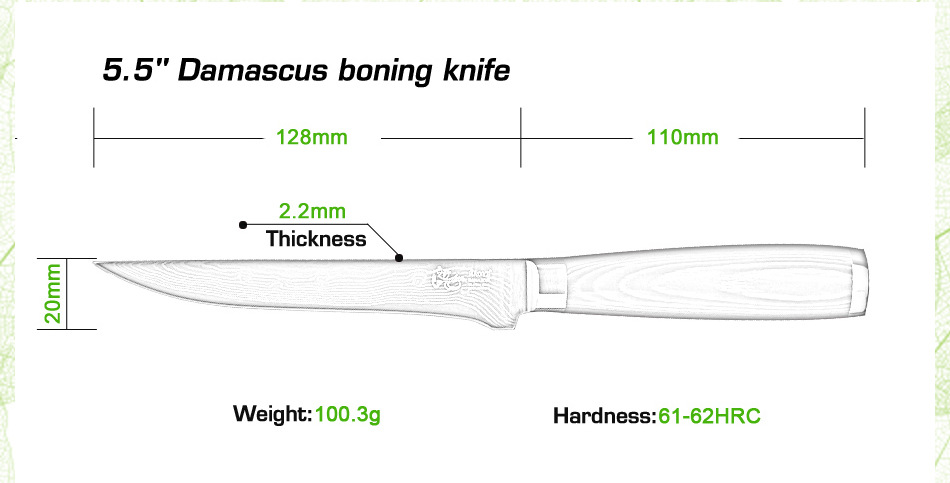 Код(5.5 "дюймовый дамасский косточки нож.) Увлекательный дамасский паттерн (линии на клинка 'tsunami-rose') Удивить гостей с вашимВизуально Потрясающие. Символизирует качество ножа. Премиум материалы(VG10 и 73-слой дамасской микро-карбидной стали) ExtremeРезкостьИ ДлинныеДолговечностью. Ремесленного(Специальная термообработка через точный контроль температуры) Имеет беспрецедентную твердость62 rockwell (HRC) . Не становясь ломким и устойчив к коррозии. Деревянная ручка(Деликатная и охрана окружающей среды) Обеспечить безопасное иУдобныеСцепление! Прочный иНескользящие. Подарочная коробка(Черные гофрированные картонные коробки). элегантный внешний вид, влагостойкий и противоударный.
