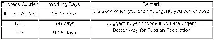 1. Пожалуйста, используйте наш калькулятор доставки, чтобы узнать стоимость доставки. 2. Товары будут отправлены в течение 3 рабочих дней после получения оплаты. 3. Пожалуйста, свяжитесь с нами через 3 рабочих дня, если вы не получили подтверждения заказа или подтверждения статуса отслеживания. 4. Мы не гарантируем время доставки, так как в каждой стране может быть разный график времени на таможенном оформлении, который может занять больше/меньше времени, чтобы проверить вашу продукцию. А также клиенты несут ответственность за все дополнительные таможенные сборы, брокерские пошлины и налоги.