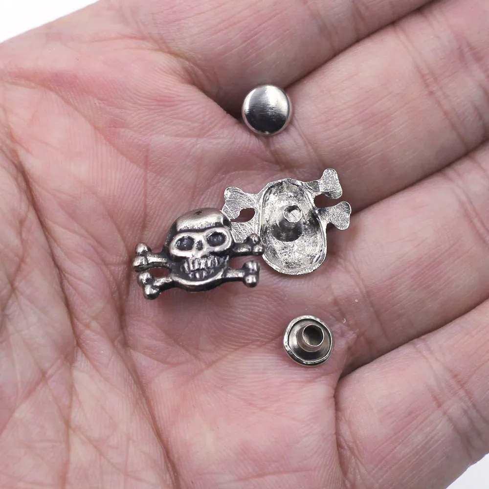 100 комплектов античный серебряный тон панк череп Скелетон Шпильки Пятна заклепки ремесла одежда обувь находки 13x17мм