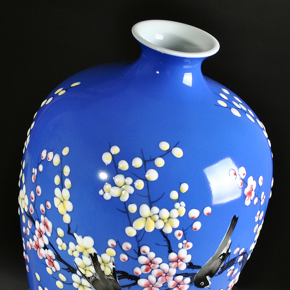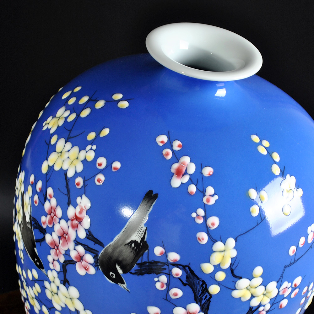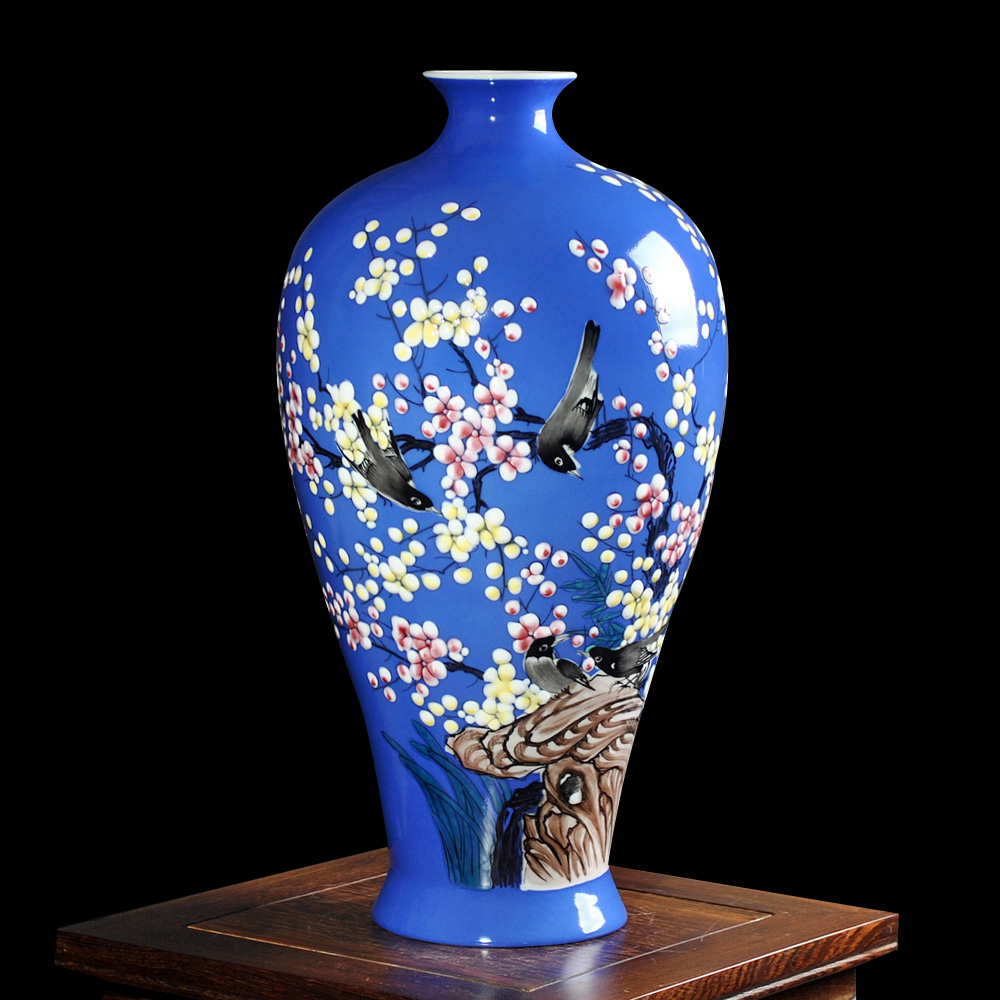 Discription Hand-painted magpie on plum tree design vase Packing:carton box with overall foam,very safe 1300 degrees high temperature firing,never fade out. Made in jingdezhen