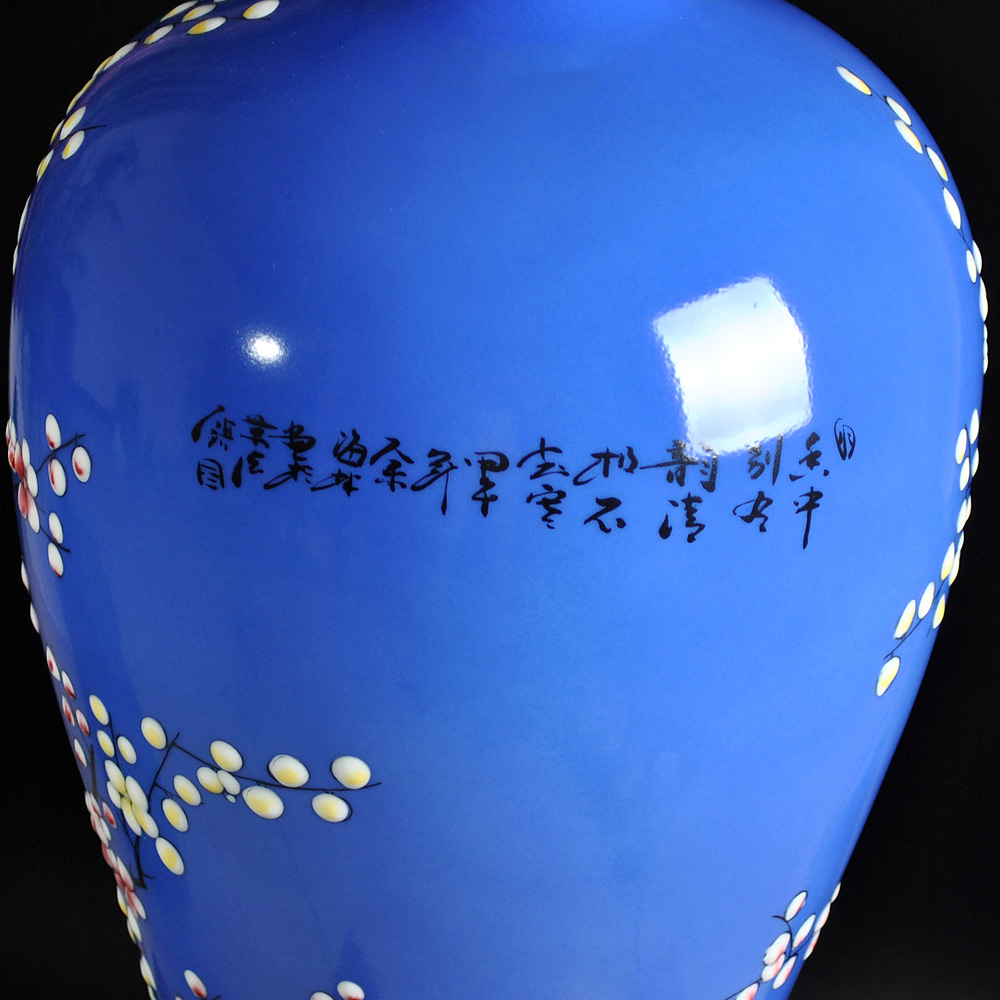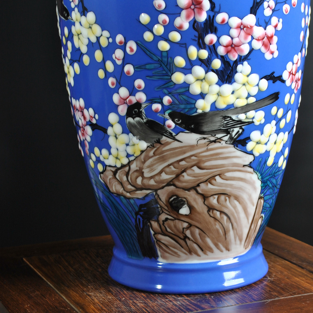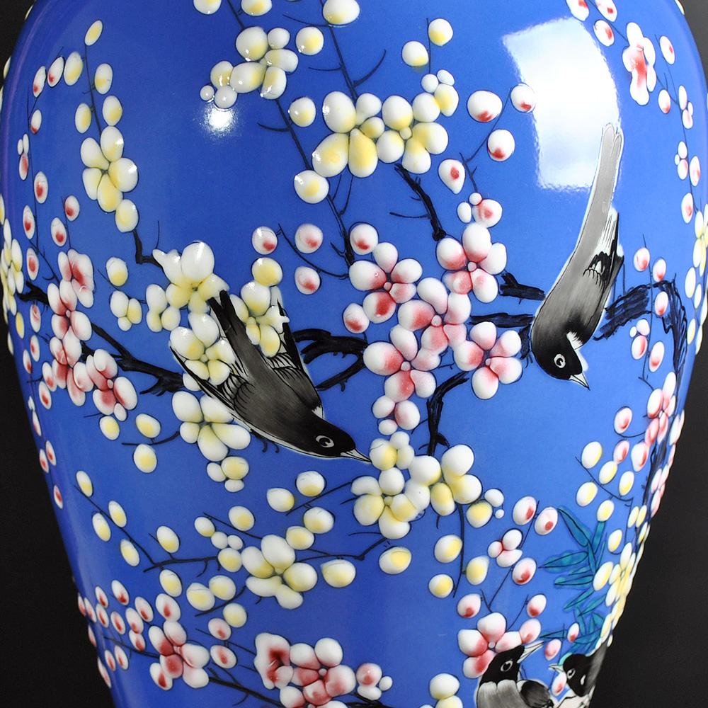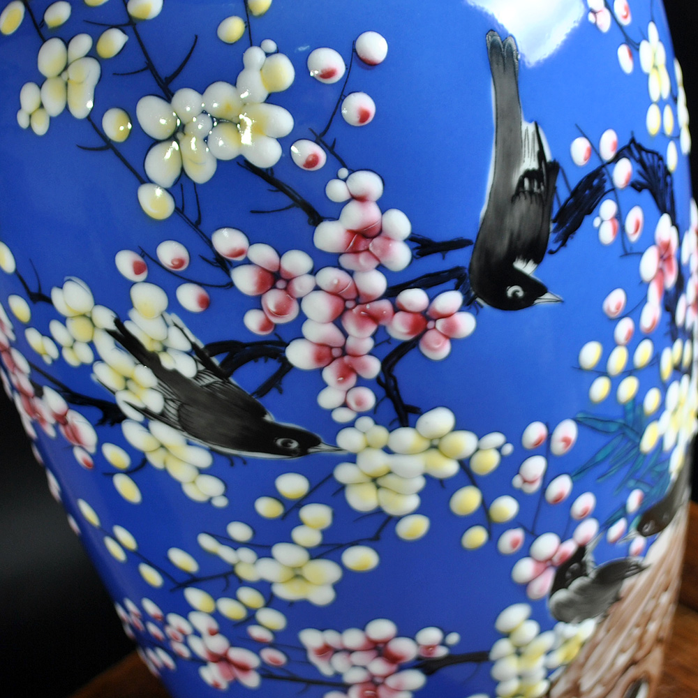 Discription Hand-painted magpie on plum tree design vase Packing:carton box with overall foam,very safe 1300 degrees high temperature firing,never fade out. Made in jingdezhen