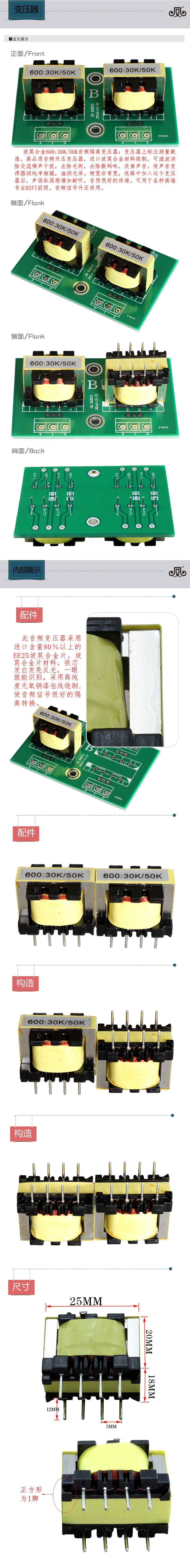 Преобразователь звукового сигнала повышающий трансформатор, основной конец двух групп и метод обмотки (1 + 1:1) может использоваться в сочетании с двумя группами, также может использоваться параллельно между двумя группами. Вторичный конец 30K имеет промежуточный кран. Гибкое применение.