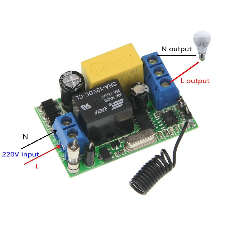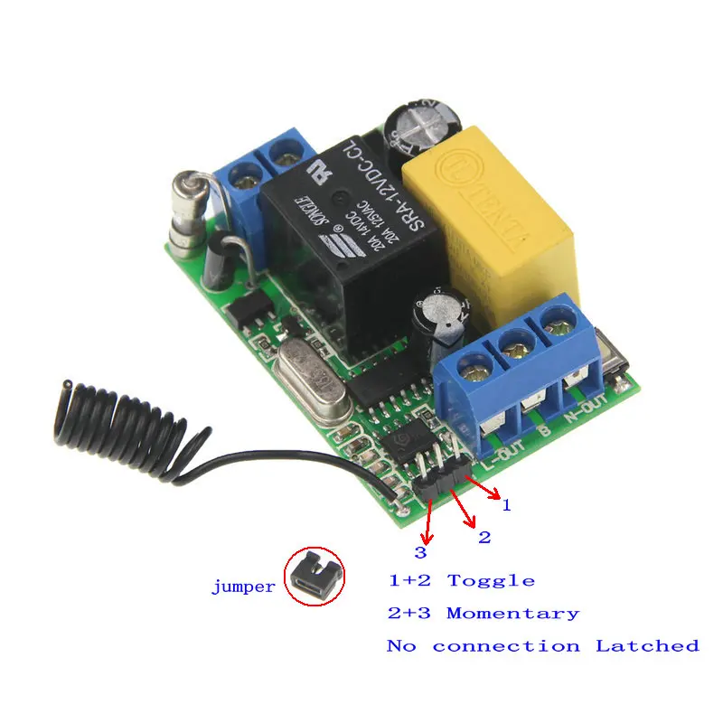 1. Передатчик Канал: 4 CHЧастота: 315 /433 МГцРасстояние дистанционного управления: 0-500 м(Идеальное расстояние без каких-либо блоков и помех сигнала, может расти или падать на 10%-90% в реальной ситуации)Код: PT2262Режим модуляции: ASKРазмер: 91 мм x 39 мм x 15 ммИсточник питания: 1 аккумулятор 23A-12 В(Не входит в комплект) 2. Приемник Рабочее напряжение: AC220V (вход AC220V выход AC220V)Максимальный ток: 10A (лучше, чем 7A)Канал: 1CHРабочая частота: 315/433 МГцЧувствительность приемника: -105 дБРабочая температура: -40 C - + 80 cВыход: Мгновенный. Переключение. Защелкивающийся регулируемыйТип кода: Обучающий код добавьте контроллер с помощью кнопки обучения на приемнике 3. Функция:(Оригинальная Настройка переключается, если вы хотите изменить функцию, сварите ее самостоятельно.) Мгновенный: Нажмите кнопку передатчика, реле приемника включено, кнопка релиза; Реле приемника выключено Переключатель: Нажмите кнопку передатчика 1 раз, реле приемника включено, нажмите кнопку снова, реле приемника выключено Блокировка: Нажмите кнопку передатчика A, реле приемника включено, нажмите кнопку передатчика B, реле выключено 4. Метод обучения: Узнать: Введите 220 В для приемника, нажмите кнопку обучения, пока не включится светодиодный индикатор. Затем нажмите передатчик, индикатор мигнет быстро, это означает, что обучение успешно. Удаление: удерживайте нажатие кнопки обучения на приемнике в течение 10 секунд, пока индикатор не включится и не начнет мигать быстро, это означает, что коды успешно очищены. 5. Посылка включает: 0/4 X приемник (с крышкой)0/1/2/4 X передатчик (Без батареи внутри)