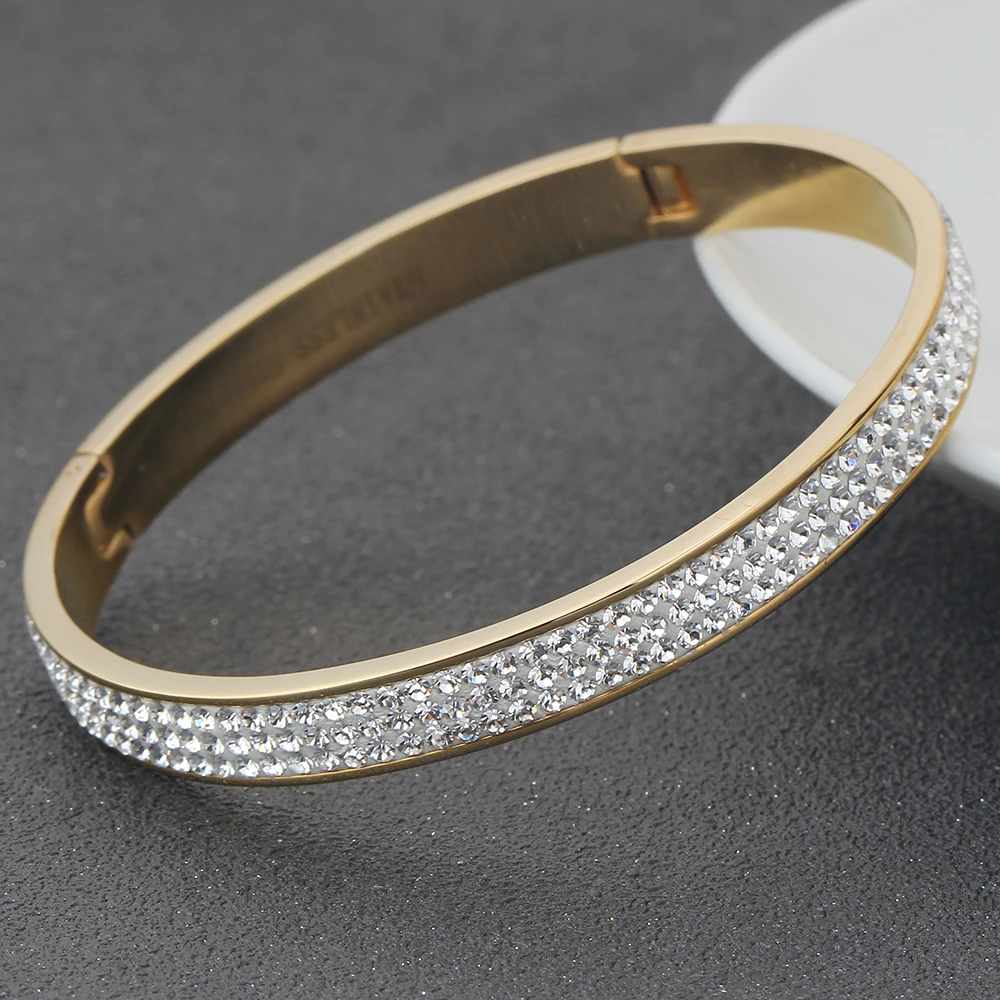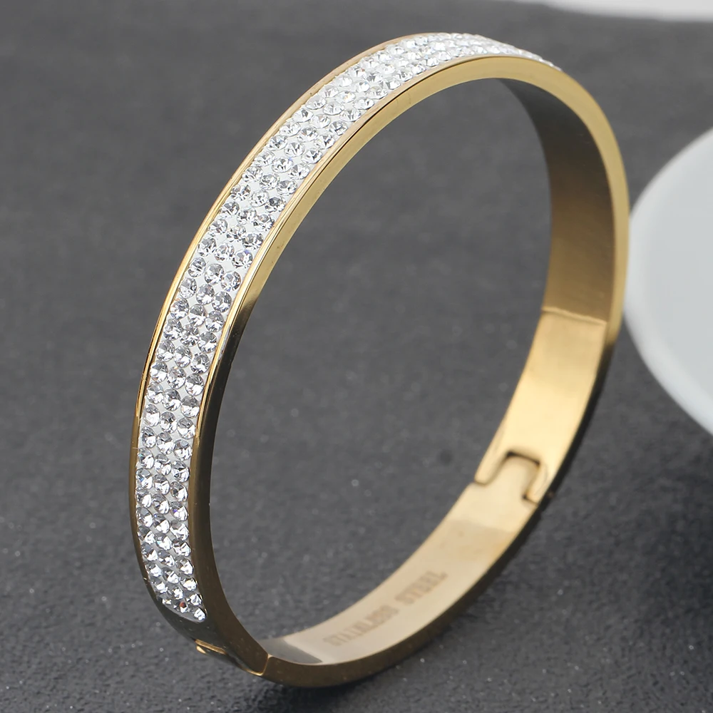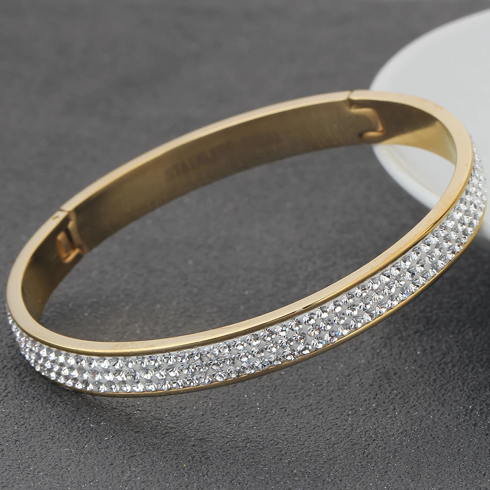 Роскошные ювелирные изделия от известного бренда, браслеты из нержавеющей стали золотого цвета и браслеты для женщин, 3 ряда, Кристальный браслет для женщин