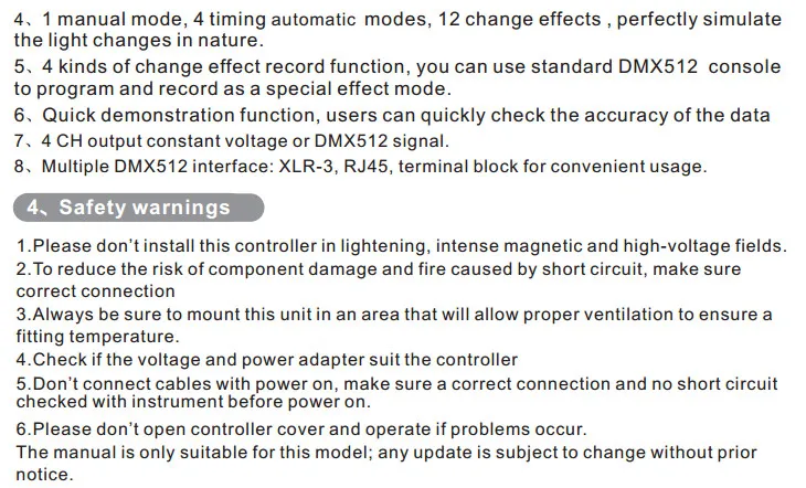 7. 4 канала вывода постоянного напряжения или DMX512 сигнала.