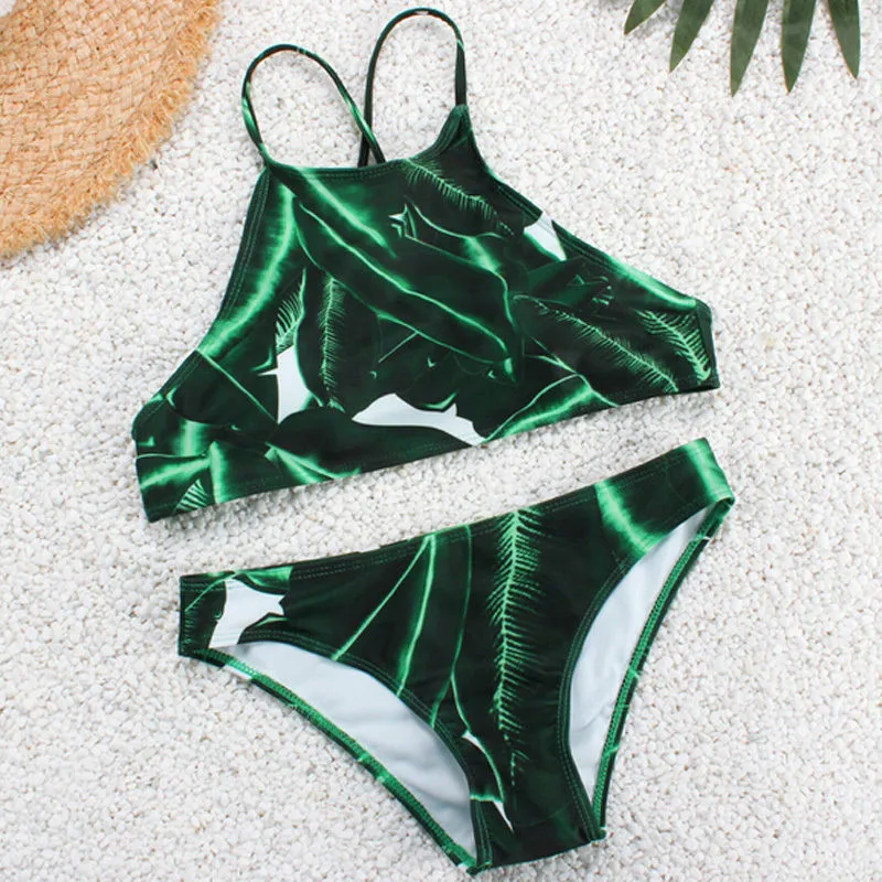 GLANE сексуальный комплект бикини Холтер телесный бикини пуш-ап купальники зеленый лист узор нижний купальник женский 2017 новая летняя пляжная одежда