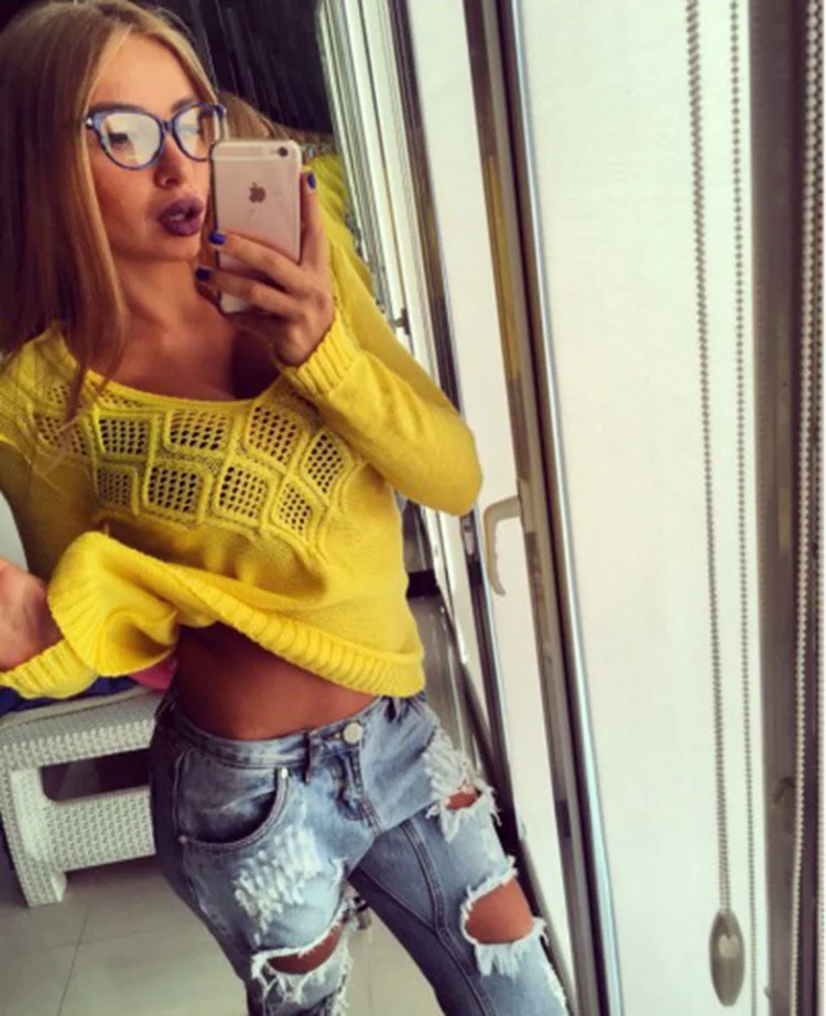 Женский трикотажный свитер с бантом и круглым вырезом длинным рукавом | Женская