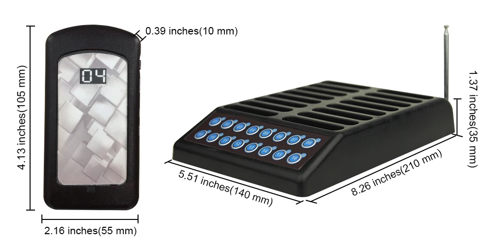 wireless paging system consists of one 16-channel call button keypad transmitter(charger base) and 16 pcs of wireless pagers( portable buzzer & vibration receivers ).