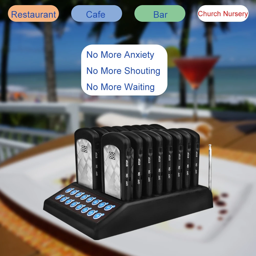 JINGLE BELLS 433 92 МГц Вибрирующая подставка Беспроводная система очередей с 16 вызывающими устройствами и 1 передатчиком-клавиатурой для гостей вызывающих.