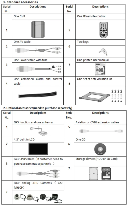 1. Основные характеристики: 4CH AHD 720P, 4 ТБ HDD, sd-карта 128GB (128GB * 1), управление USB mouse, VGA, OSD, RS485 (PTZ), RS232, GPS, задержка отключения питания (0 ~ 999 минут)