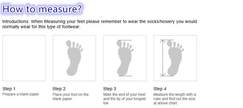 Примечание 1:Из-за различных размеров стандартов различных компаний и заводов, пожалуйста, убедитесь, что выбрали соответствующийСвяжитесь с намиРазмер зависит от длины вашей стопы. Если вы не уверены в размере, свяжитесь с нами. Мы ответим вам, как только получим ваше сообщение.