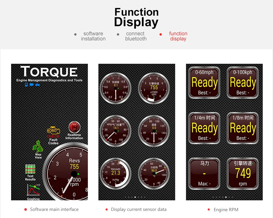 * Display real-time operating performance of the car, such as momentum, vehicle speed, oil pressure, coolant temperature, engine load, intake manifold pressure, throttle position, the values of oxygen sensors, air intake temperature, and more.